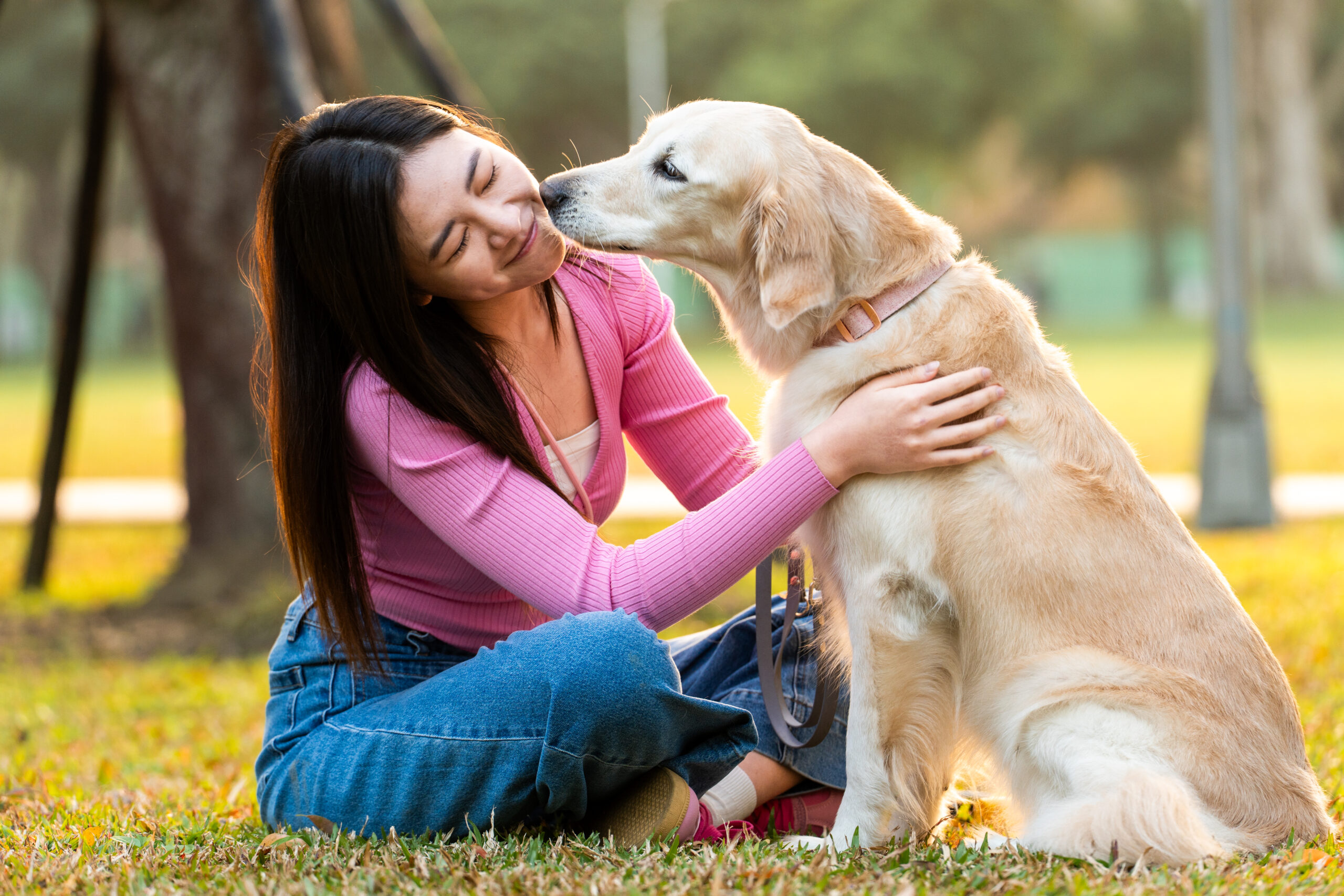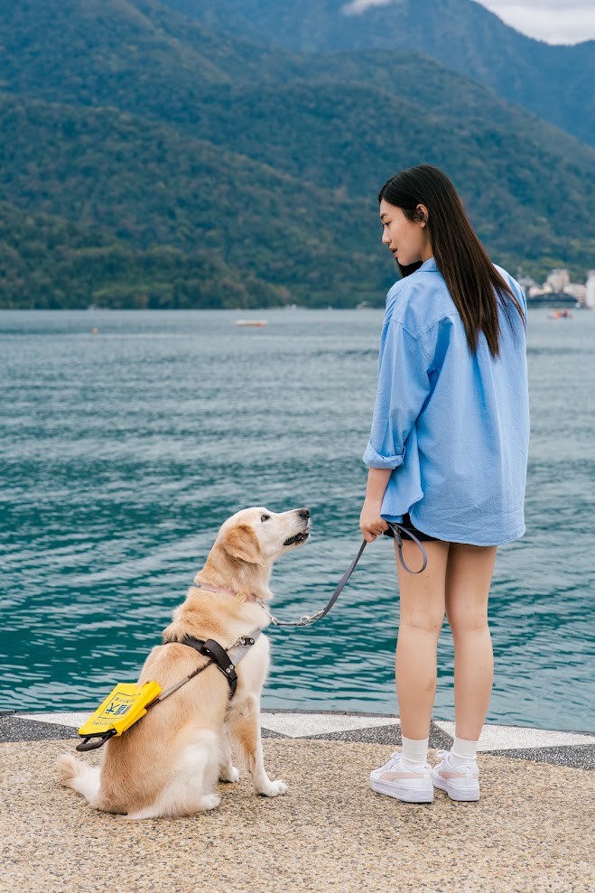 女主角李紫嫣與導盲犬親膩互動感人一幕。劇照/「突破三千米泳氣」電影提供