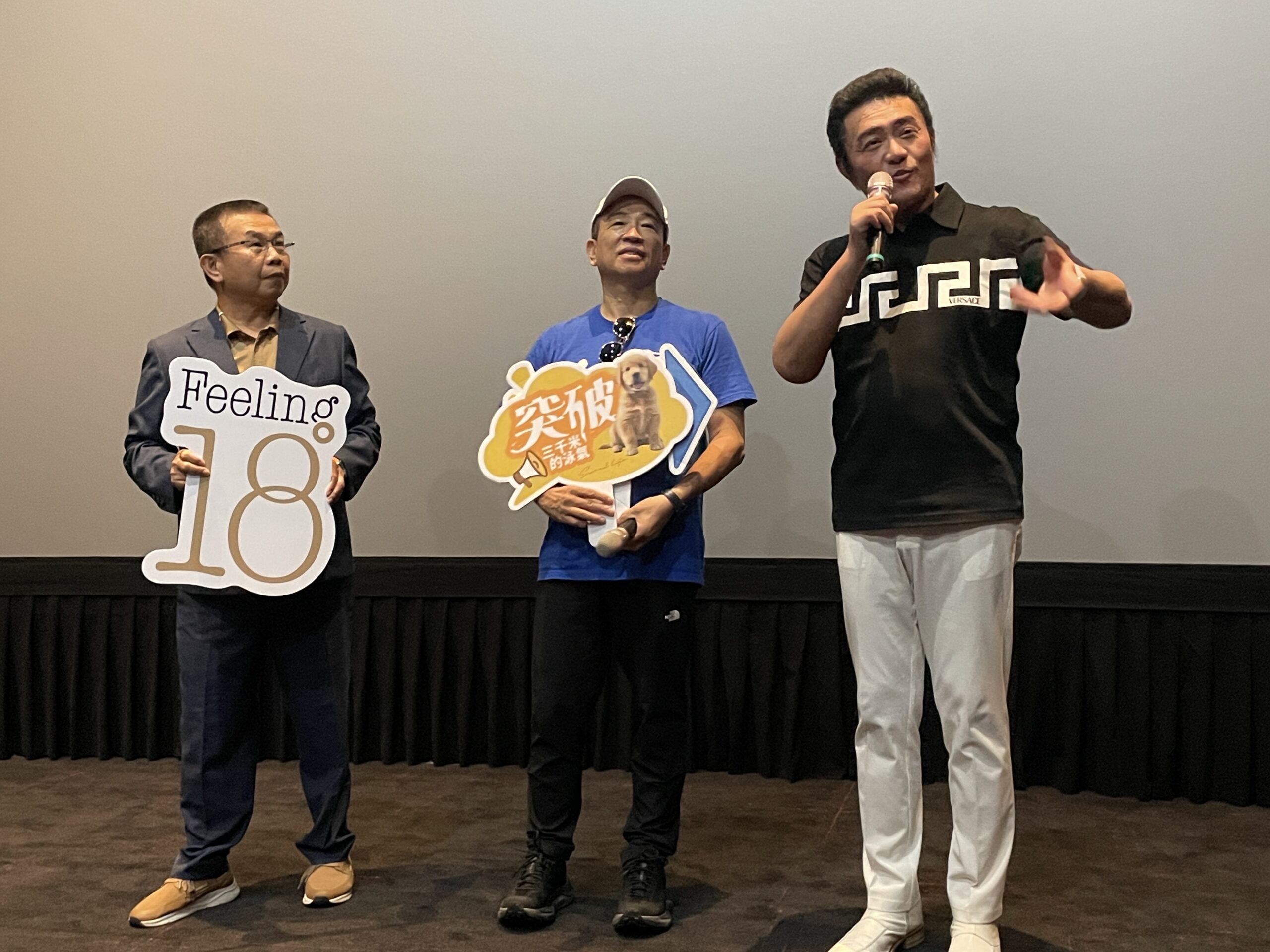 製片人李㼈和導演安景鴻在《突破:3000米的泳氣》台中市包場試映與出資讚助的Feeling18度C董事長茆晉日牂一起向觀賞的來賓解說影片的內涵與精華。