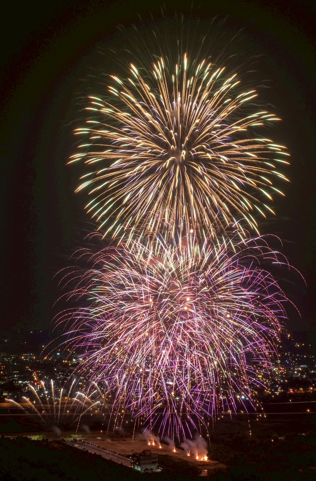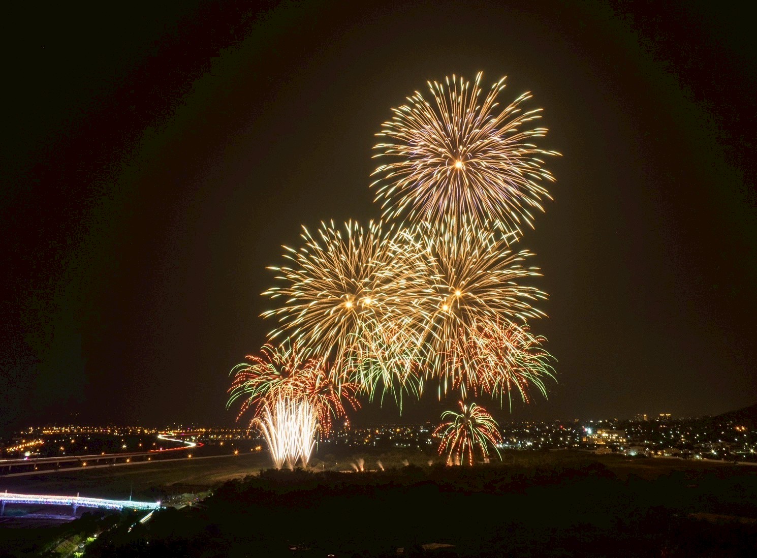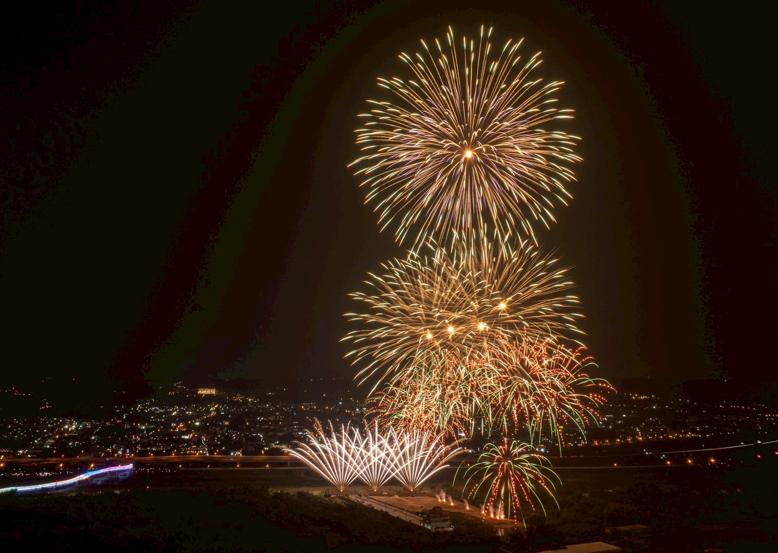 國慶焰火試放並測試3-8吋焰火彈的佈彈與落焰狀況,千發焰火彈把南投空照得璀璨極了。圖/南投縣政府提供