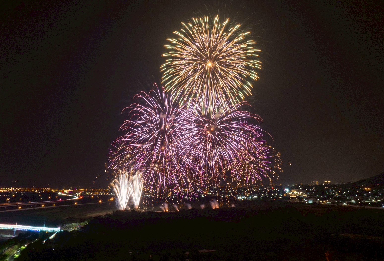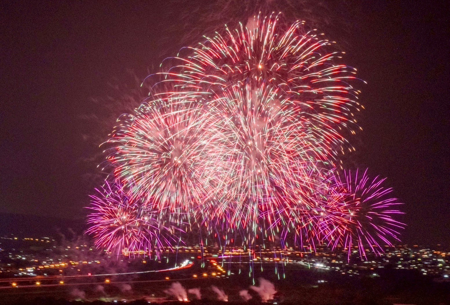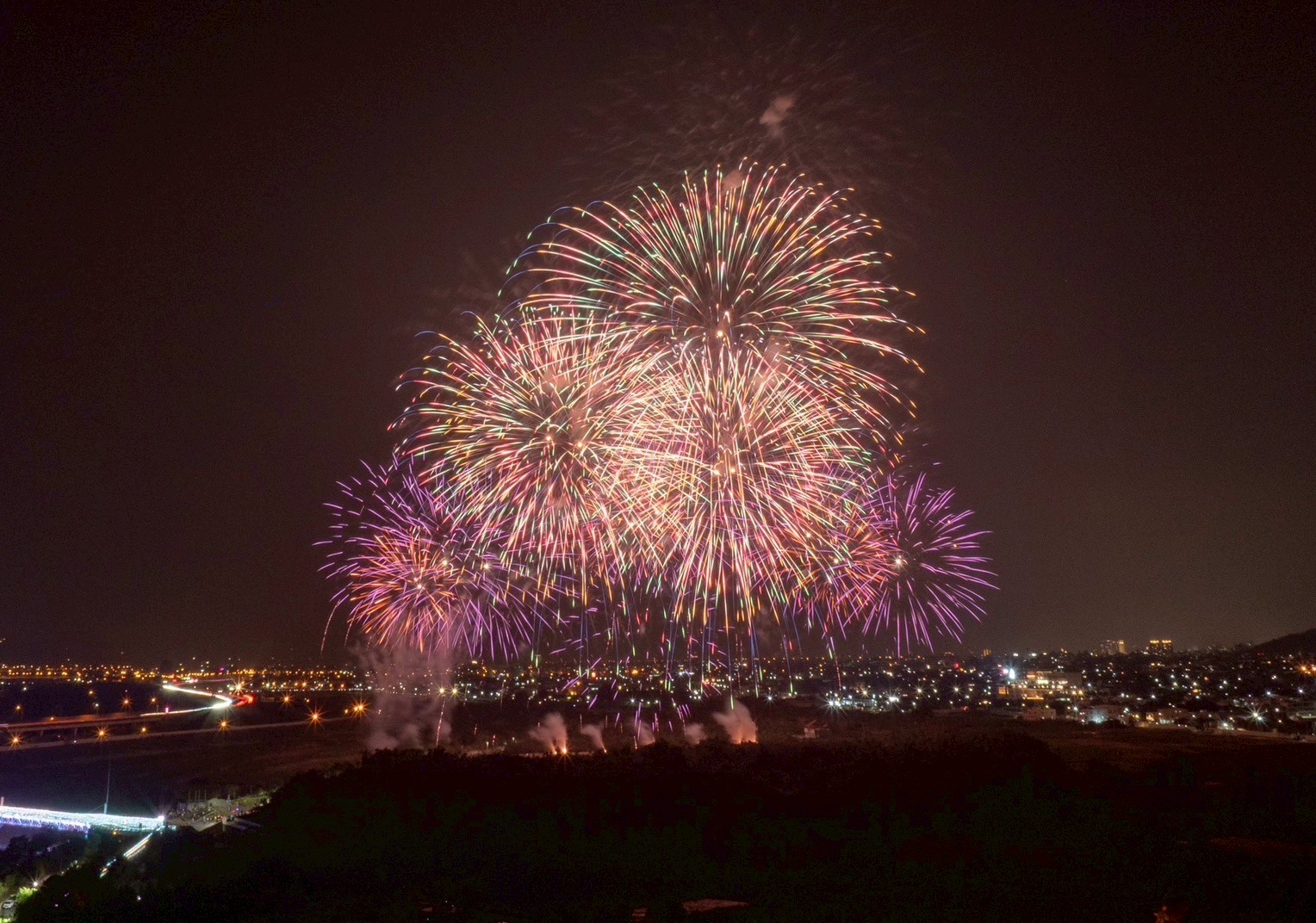 國慶焰火試放並測試3-8吋焰火彈的佈彈與落焰狀況,千發焰火彈把南投空照得璀璨極了。圖/南投縣政府提供