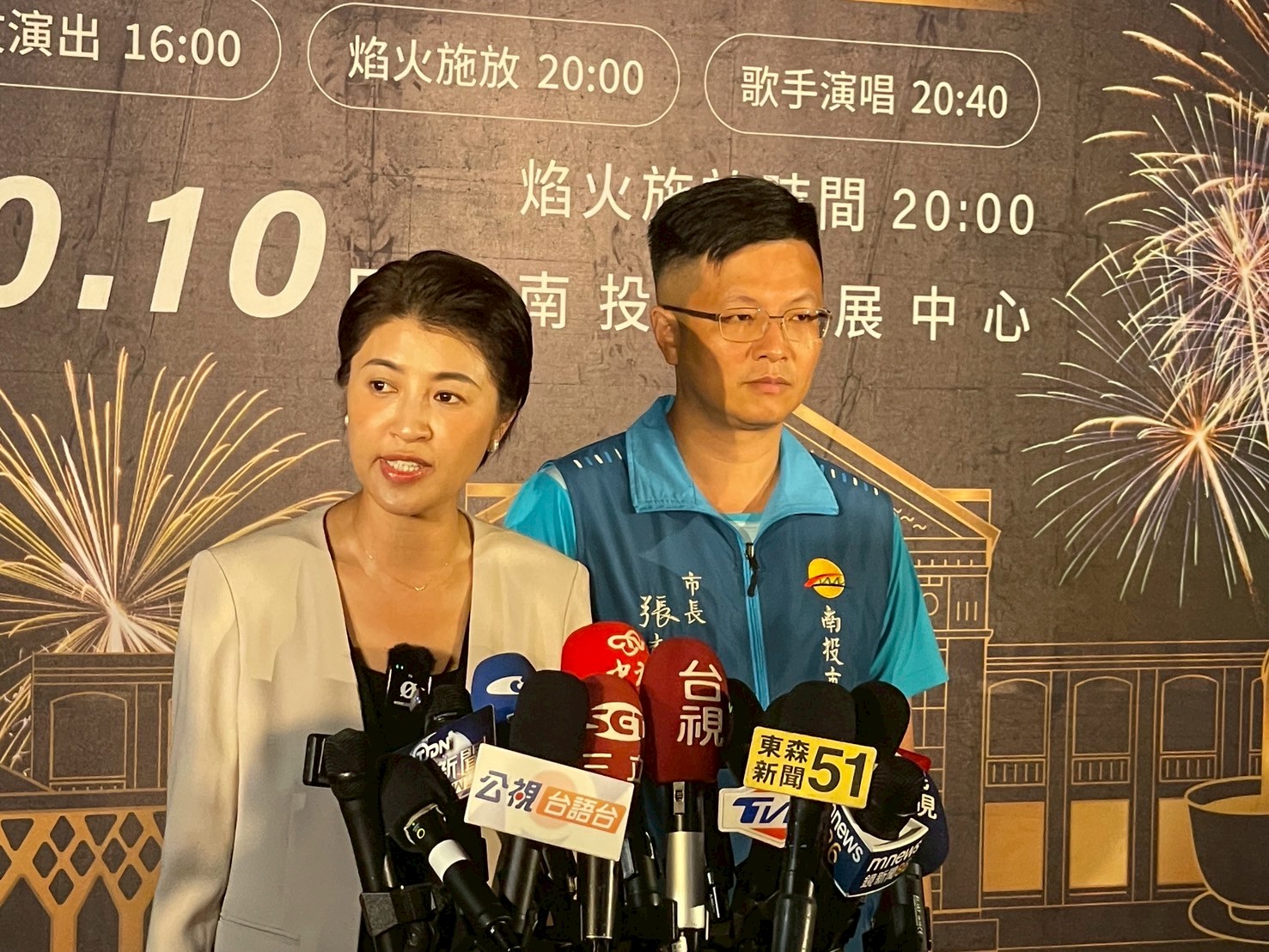 「這是南投建縣以來,第一次爭取到國家慶典活動。」許縣長表示,國慶焰火在南投施放,縣府嚴陣以待,雖然南投腹地及相關條件,比不上其他縣市,但也希望藉此機會讓遊客可以慢遊南投,而不是快閃南投,10月10日國慶焰火將在南投貓羅溪畔施放,由於焰火場地就是舉辦南投燈會場地,大家十分熟悉。為了讓更多民眾欣賞焰火,許縣長感謝南投市長張嘉哲,規劃易經大學、旺來產業園區,提供南投市民欣賞焰火去處。