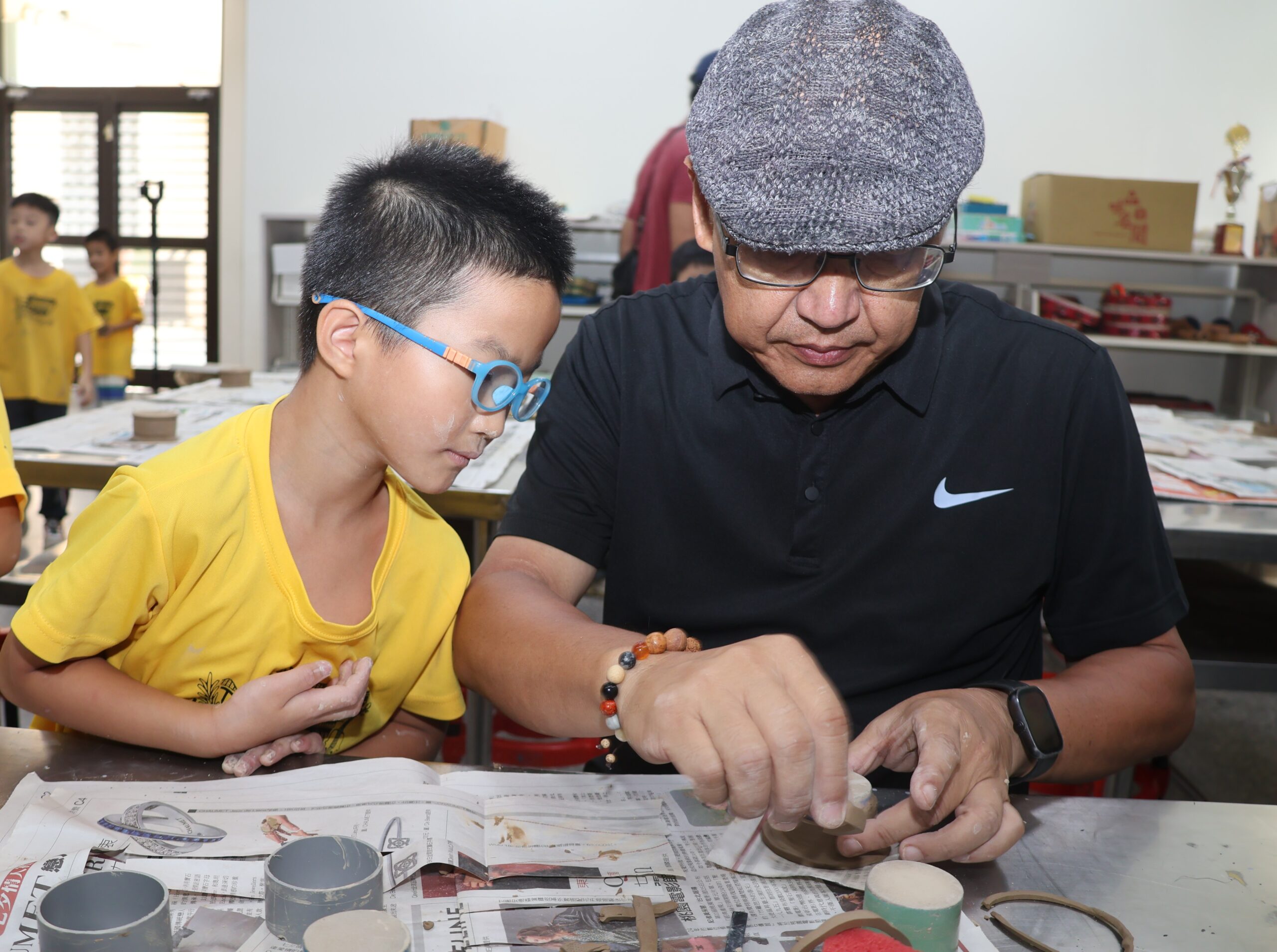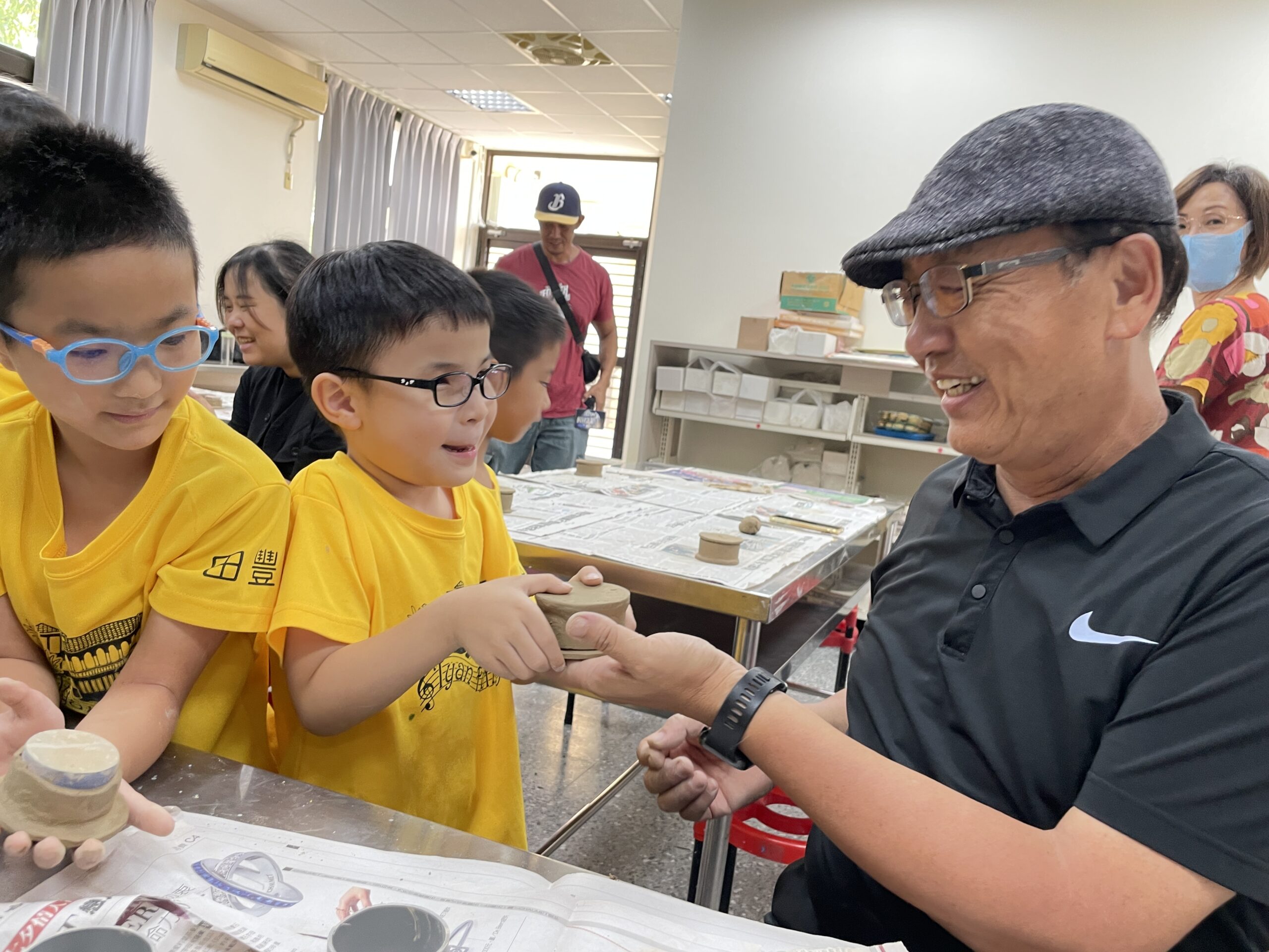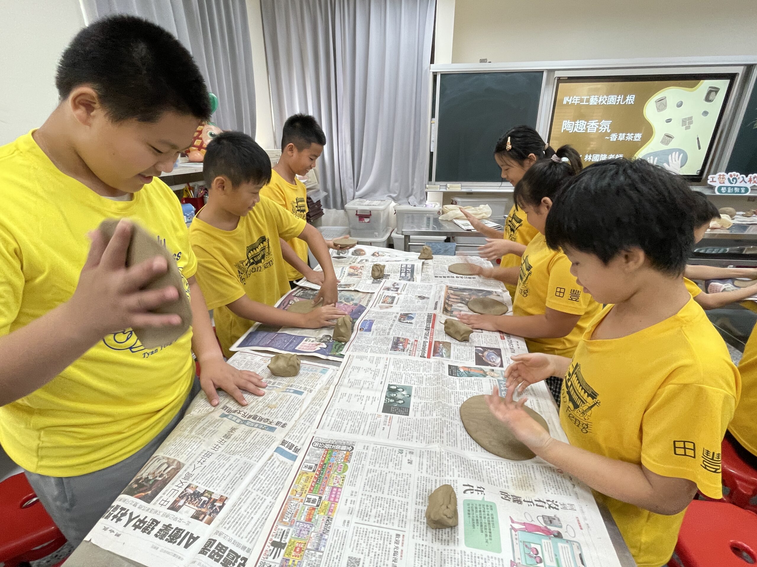 台灣工藝中心114年工藝校園札根列車,10/1駛進名間鄉最美西班牙建築的田豐國小,水里蛇窯工藝師林國隆帶助理到校傳授陶藝,學生快樂玩陶現場。