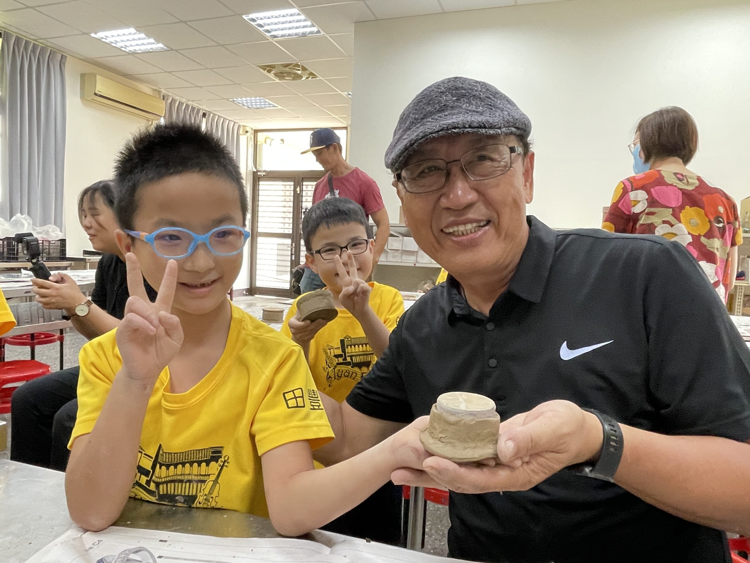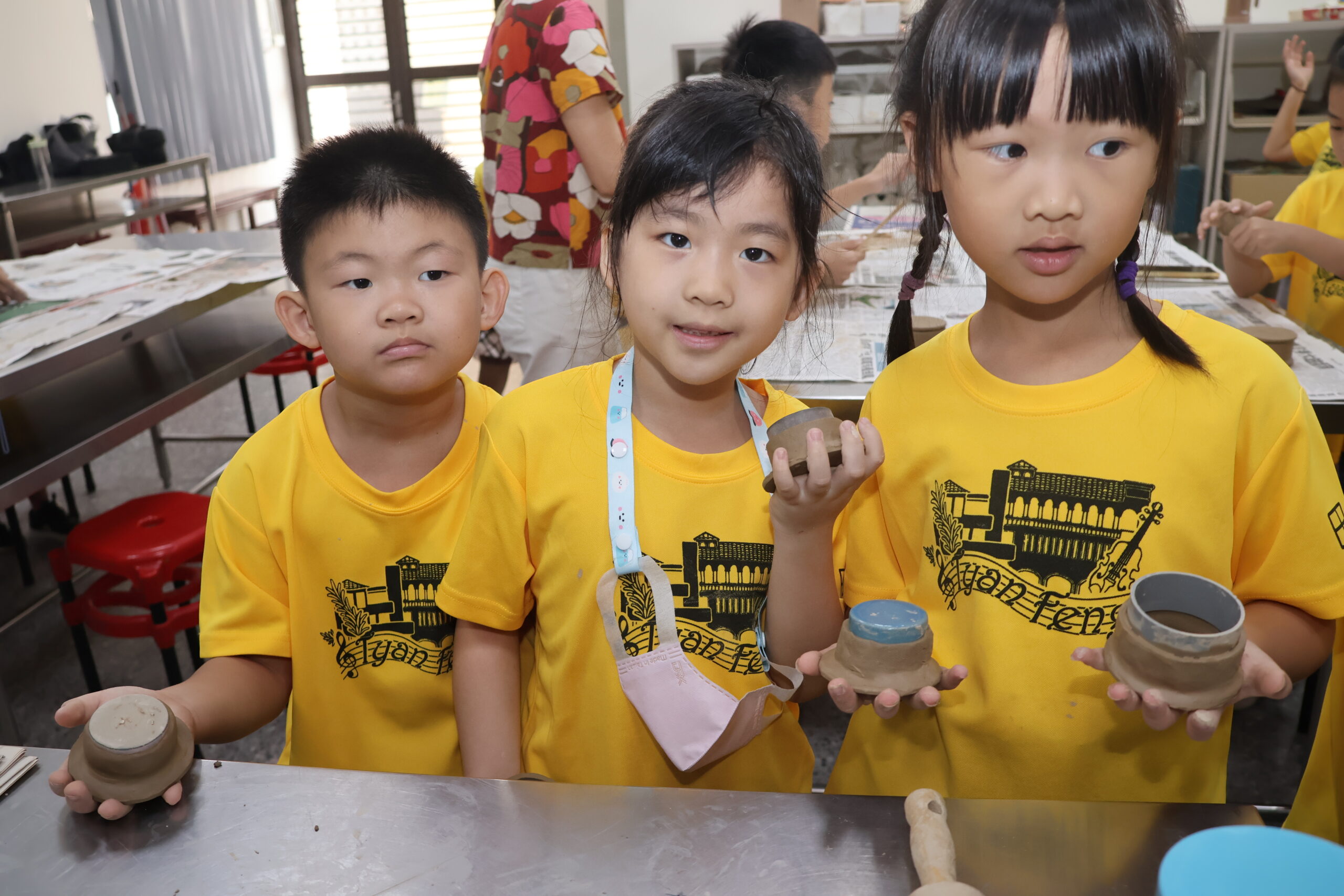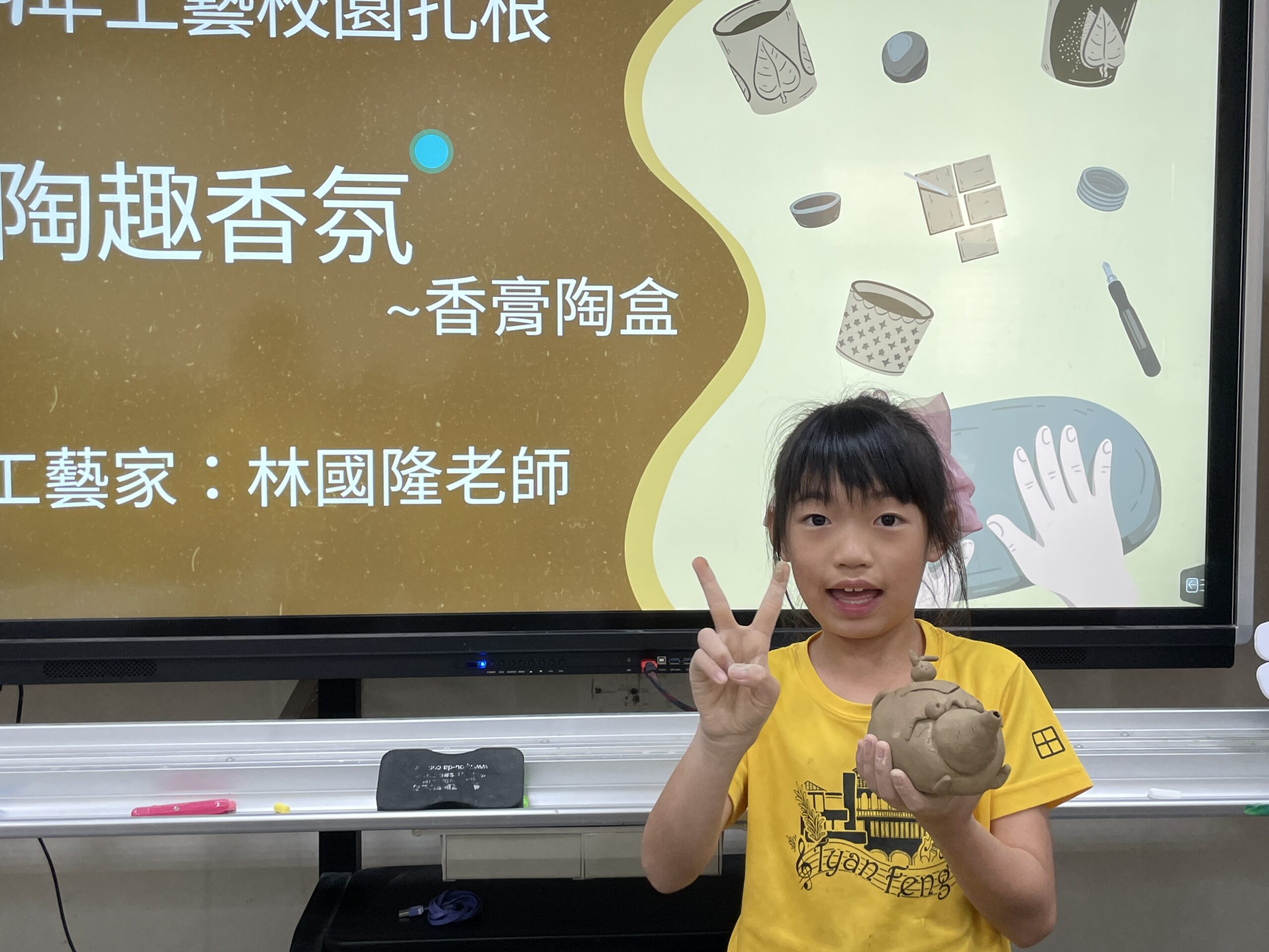 低年及同學學習以陶土捏製香膏陶盒,同學直呼好有趣好好玩,每人拿起作品快樂合影。