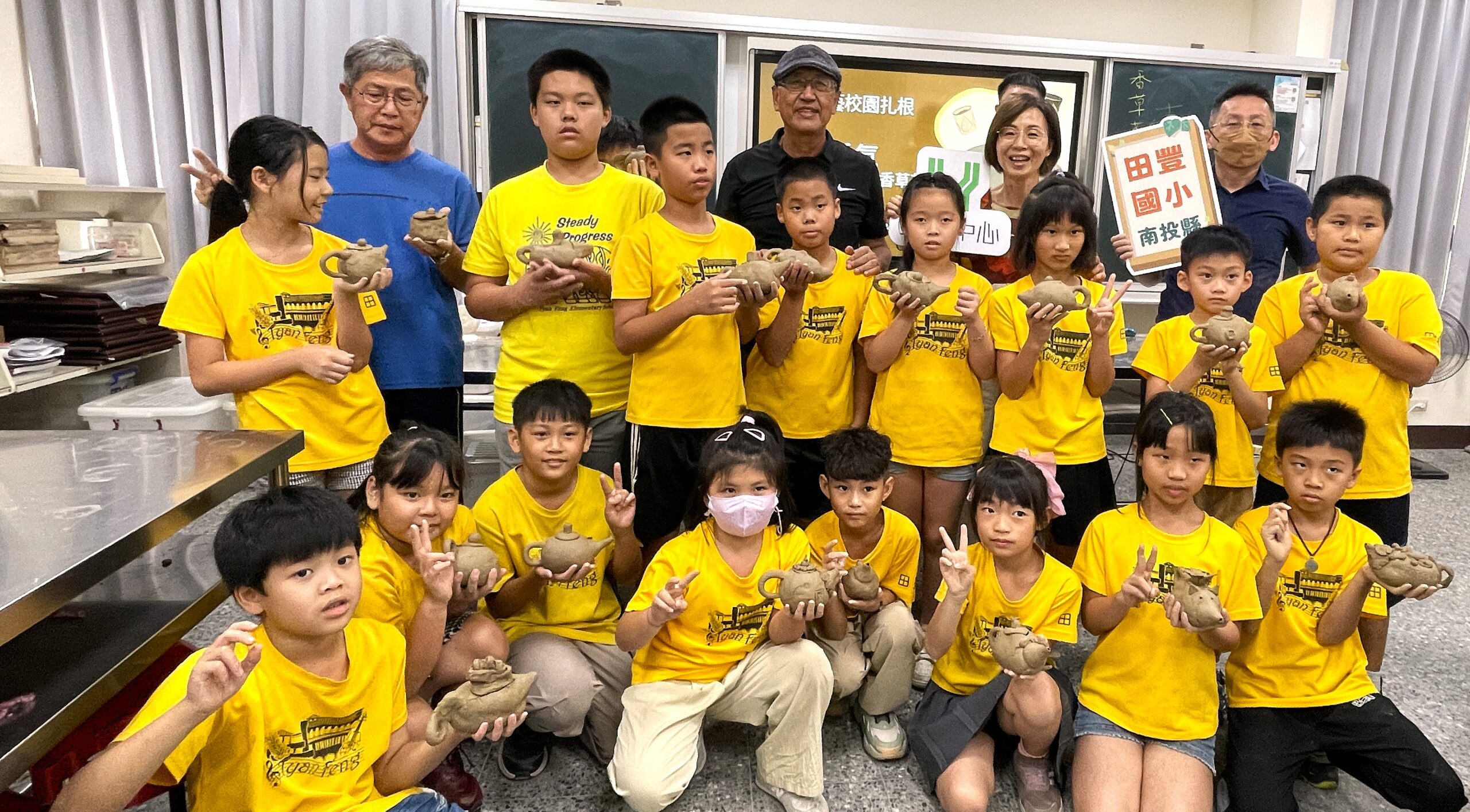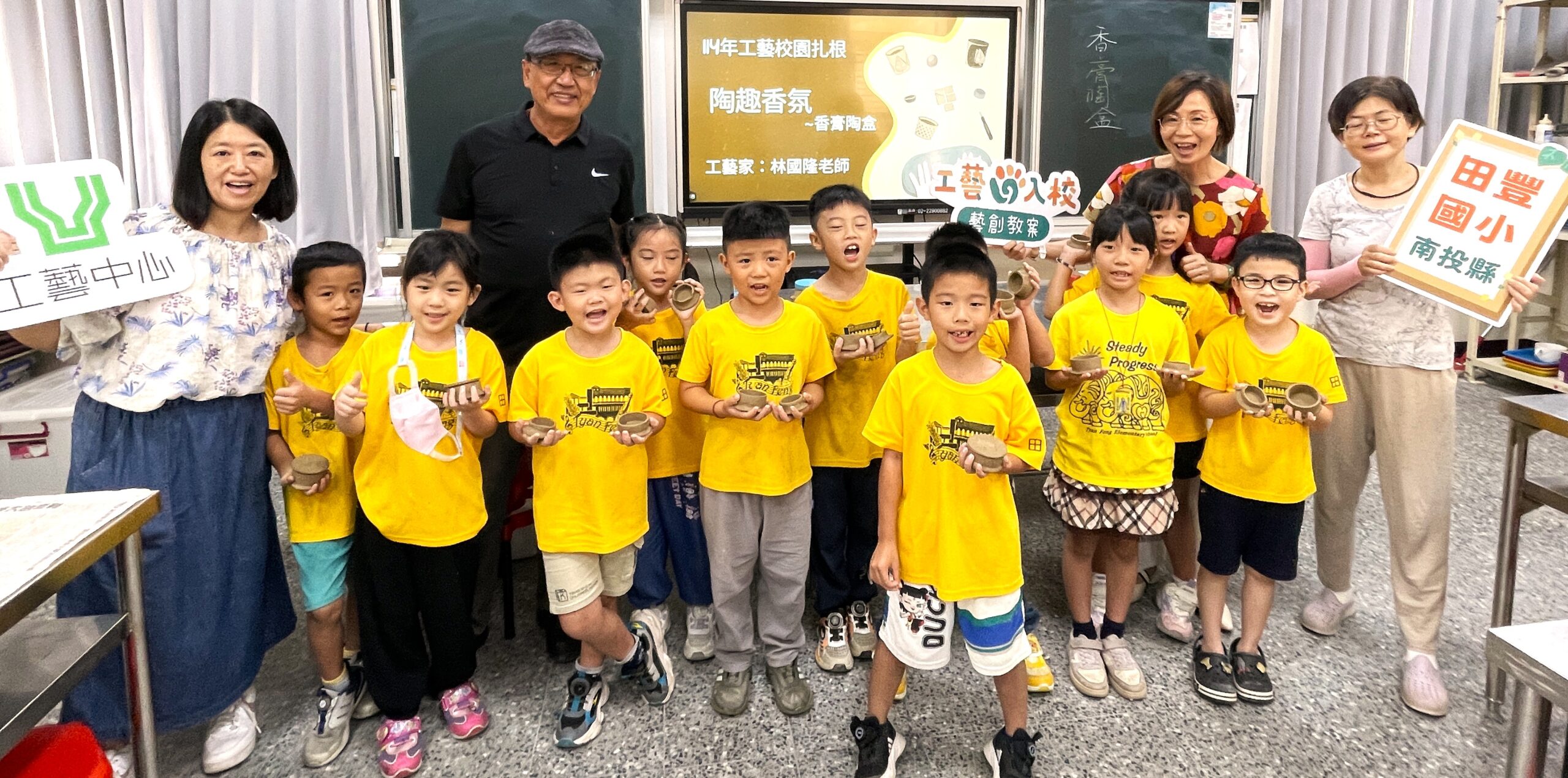 台灣工藝中心114年工藝校園札根列車。10/1駛進名間鄉最美西班牙建築的田豐國小,水里蛇窯工藝師林國隆帶助理到校傳授陶藝,中高年級DIY香草茶壼的成果豐碩,師生心情超好。