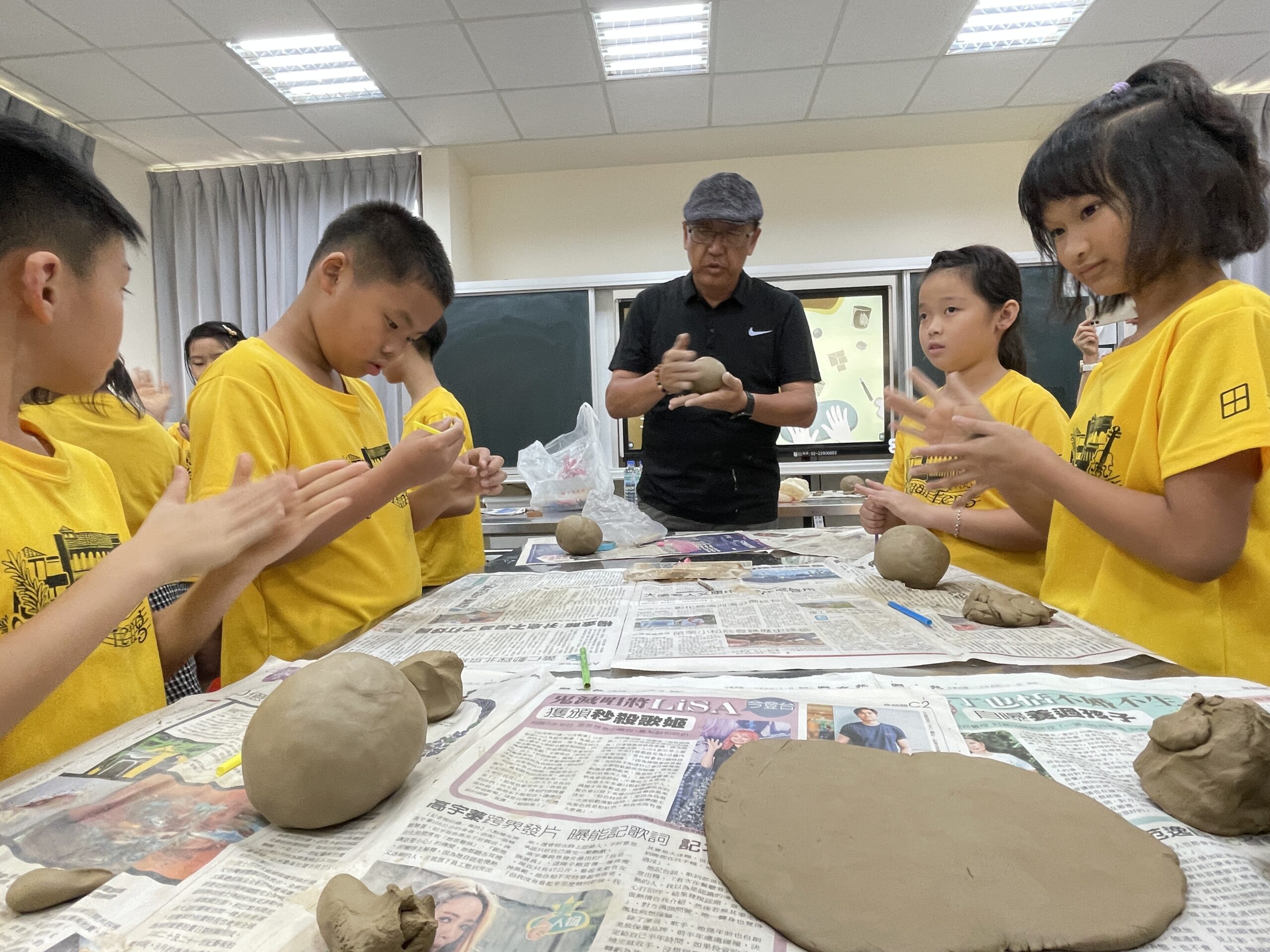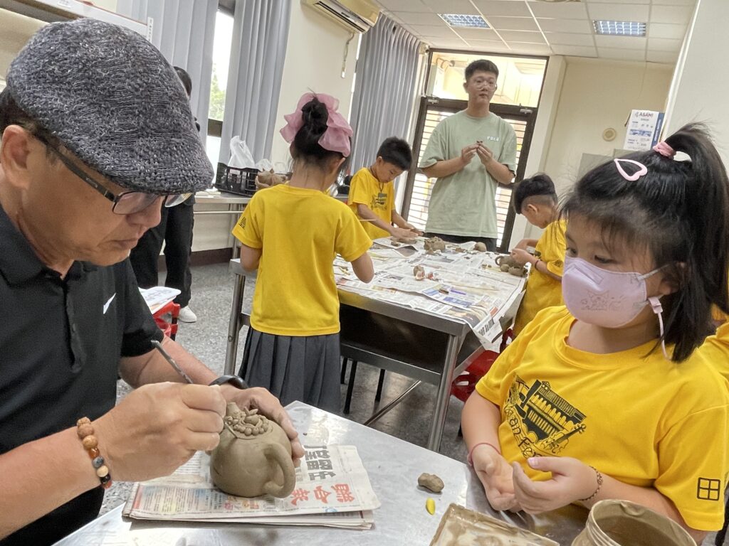 低年及同學學習以陶土捏製香膏陶盒,同學直呼好有趣好好玩,林老師與學生熱絡互動。