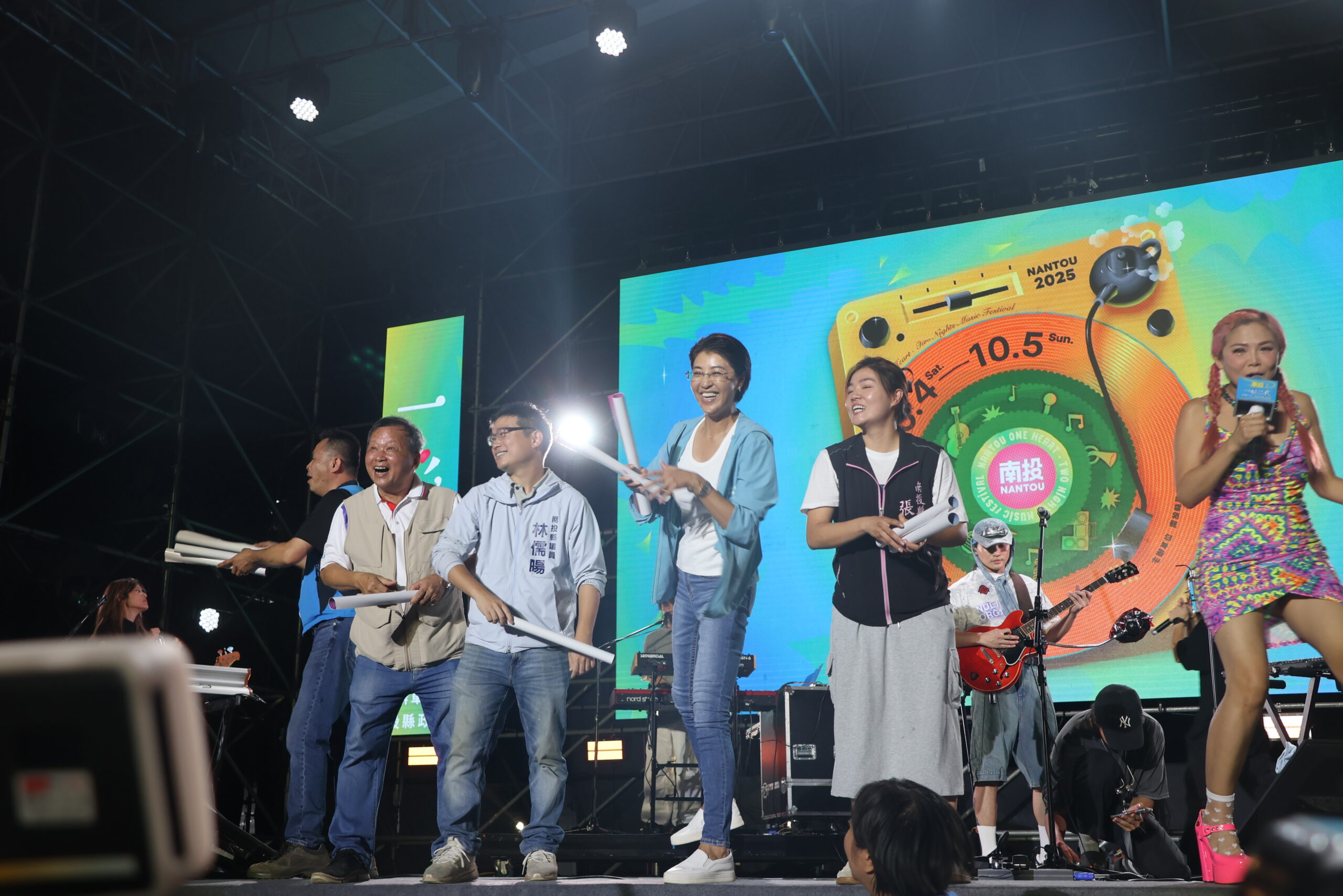 縣長許淑華與副縣長王瑞德,議員林儒暘等在音波之夜向祝賀滿場觀眾中秋快樂,並致送音波之夜石氣天團簽名海報,把氣氛帶到最高潮。圖/南投縣政提供