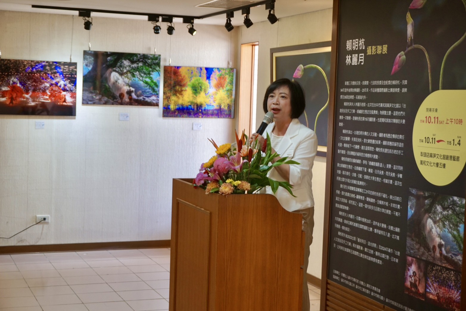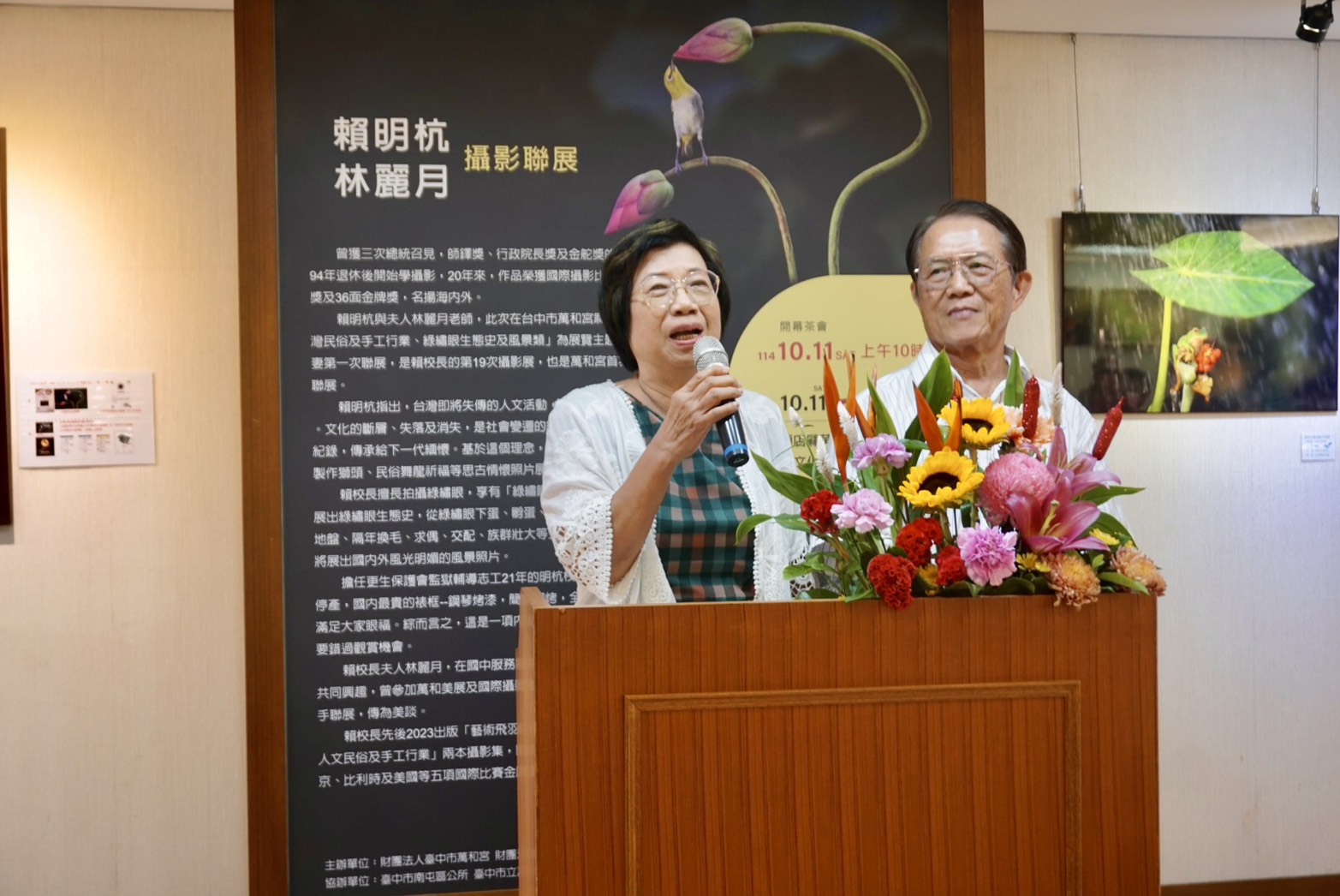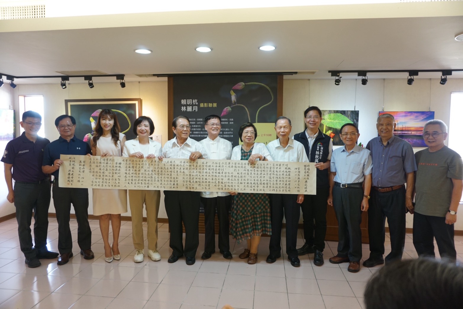 前行政院文建會副主任委員洪慶峰,用書法描述介紹賴校長一生成就,他請賴校長夫婦拉開捲軸,營造熱鬧氣氛。洪副座稱讚賴校長做什麼像什麼,是賴明杭一生的寫照。圖/台中市萬和宮提供林麗月老師展出15件作品    賴明杭精闢解析拿到多項國際攝影金牌的「曲荷—嬌點」及高美濕地作品內涵    這次展出「台灣民俗及手工行業、綠繡眼生態史及風景類」等作品55件    人文作品屬首次展出