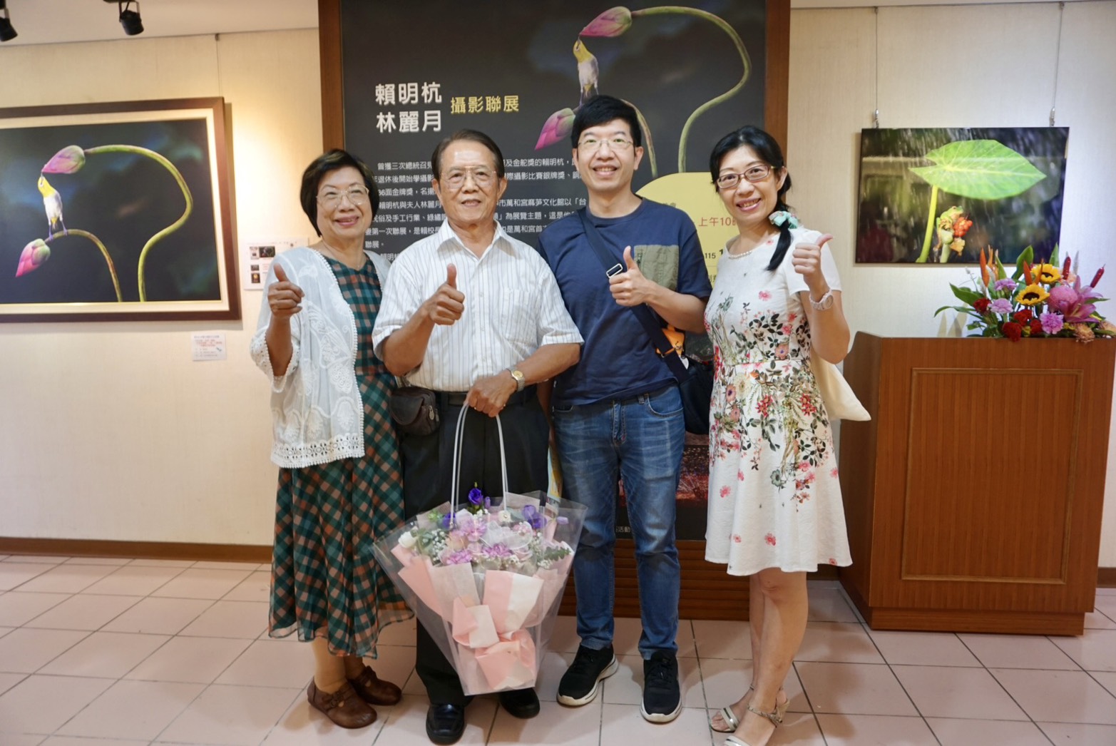 台中市萬和宮麻芛文化館「創意藝廊」雙號十連假的第二天貴賓雲集開心欣賞賴明杭、林麗月伉儷攝影聯展,兩人展出多樣精彩作品55件,展期至明年元月4日,開幕茶會吸引教育界、藝文界友人前來觀展,駐足於作品前稱讚聲此起彼落,讚嘆夫妻倆的專注、敬業及推廣生活美學社會教育的用心。萬和宮董事長蕭清杰說,這是萬和宮首度夫妻聯展,相當珍貴。他稱讚賴校長首度展出一些沒落手工藝的人文作品及綠繡眼生態史,還有難得一見的鋼烤裱框,都很值得參觀。