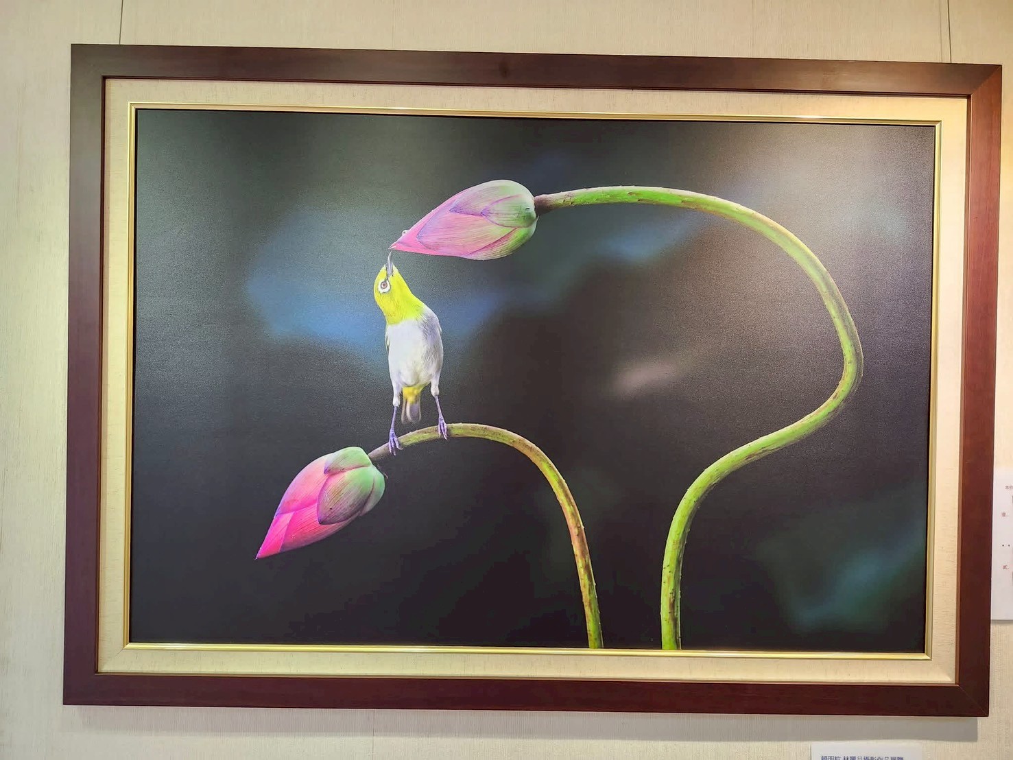 賴校長擅長拍攝綠繡眼     耗時十年完成綠繡眼生態史    展出昂貴的鋼琴烤漆裱框