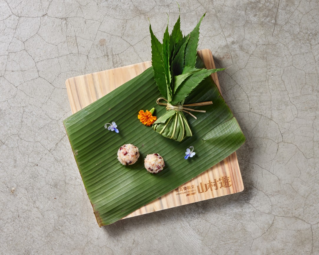 大地饗宴的前菜取材於獵人以「八角金盤葉」包裹小米與煙燻肉作為狩獵口糧的故事的獵人粽。圖/林保署南投分署提供