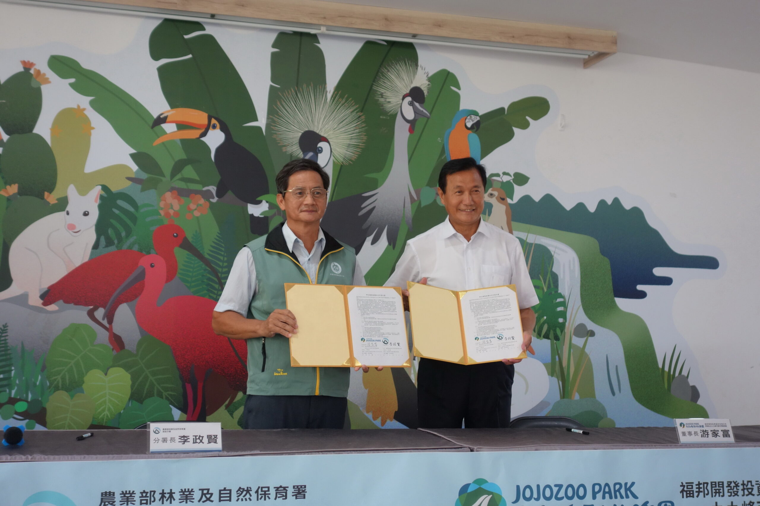 農業部林業及自然保育署光復節前夕與福邦開發投資公司附設私立九九峰可愛世界動物園董事長游家富正式簽署野生動物救護站合作意向書,提升野生動物醫療照護能量。圖/九九峰可愛世界動物園提供