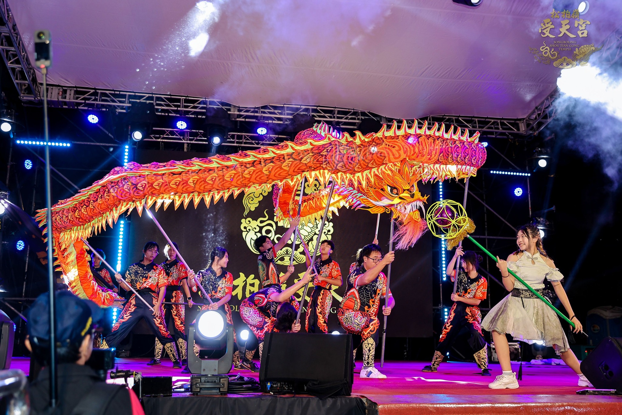 「北極玄天上帝飛昇得道全國聯合慶典」為期兩天,25日晚間「玄武之夜.聯歡晚宴」由營北國中舞龍隊揭開序幕。圖/截自松柏嶺受天宮臉書粉絲頁