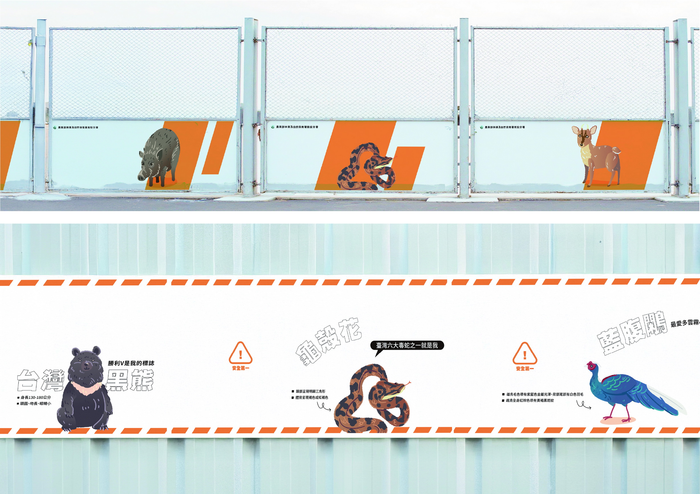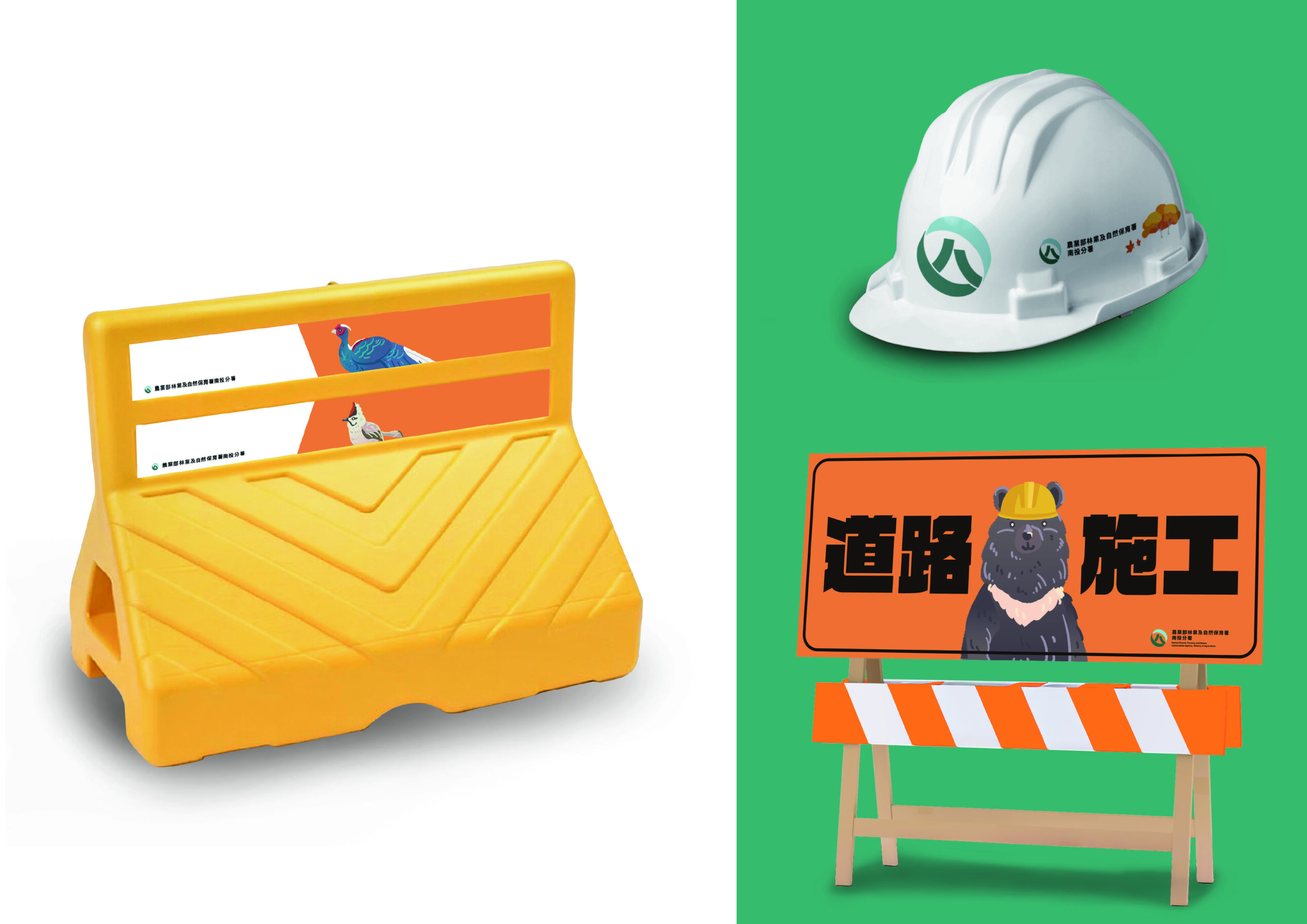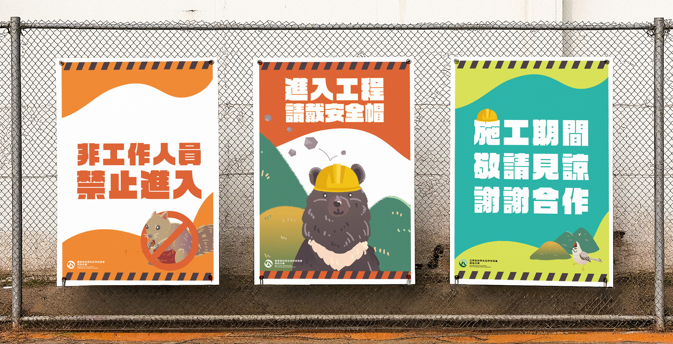 得到國際設計大將的〈治山防災工程〉識別系統設計,源於集水區治理業務同仁觀察到傳統工程標示在視覺呈現上風格偏重功能取向,因此改以品牌視覺為核心進行系統性設計、整合在地物種、保育觀念與工程語彙,應用於圍籬、警示標語與告示牌等,使公共工程融入環境教育意涵;主視覺採手繪筆觸與低彩配色,描繪臺灣黑熊、石虎、冠羽畫眉等中部特有保育物種,搭配山櫻花、霧社櫻等植物輪廓,形成如生態圖鑑般的視覺母體。