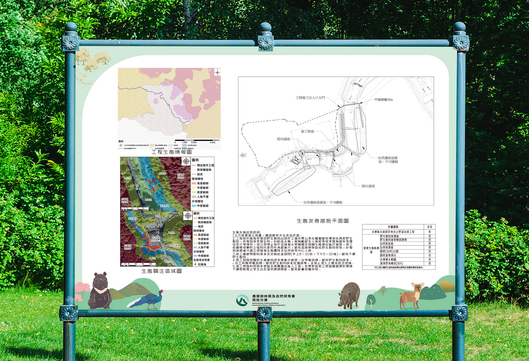 林保署南拓汾署的防災工程所設計生態告示牌,融入環境意識,讓見者印象深刻。圖/林保署南投分署提供
