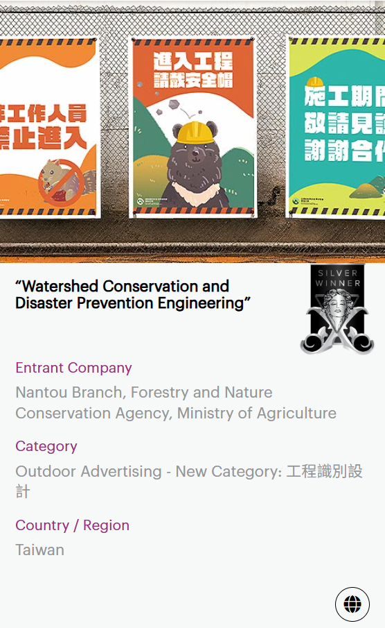 農業部林業及自然保育署南投分署以《治山防災工程》品牌識別系統,榮獲2025年美國MUSE設計大獎戶外廣告類-銀獎,成為農業部首件以工程識別設計獲國際肯定之作品;這件作品以「自然共生、永續循環」為核心理念,展現集水區治理工程在圍籬、警示標語與告示牌等兼具專業美學與生態意識的創新成果,讓世界看見臺灣推動永續林業治理的設計實力。