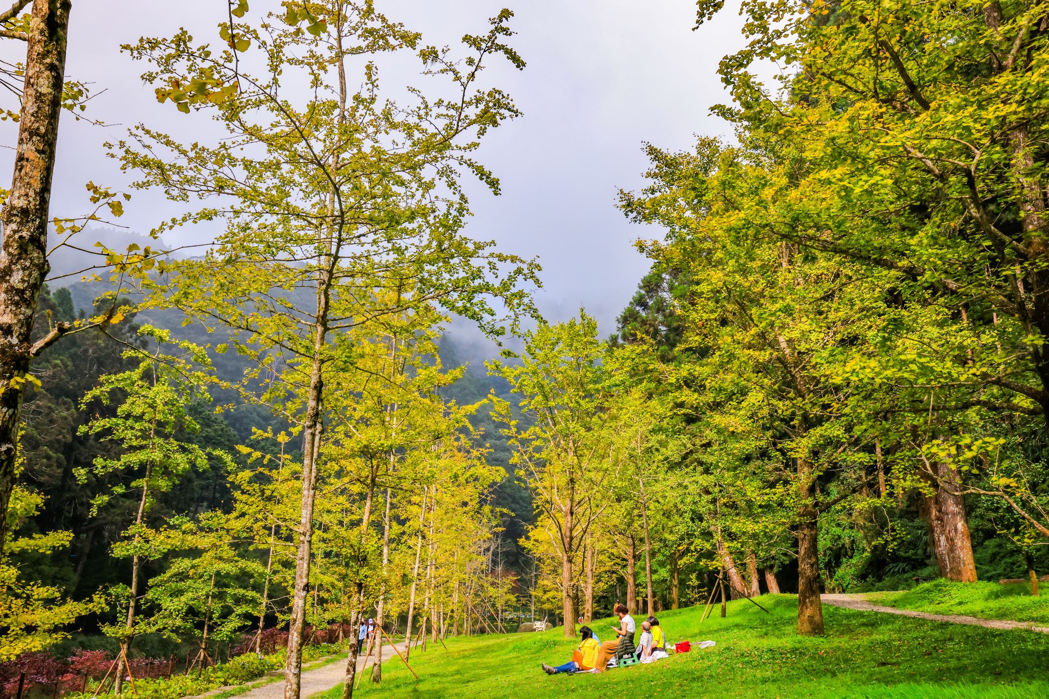 時序入秋 中海拔杉林溪森林生態渡假園區紫葉楲 青楓與銀杏上演變裝秀 綠葉轉黃變紅 楓紅達3成綠野上顏色 6000株波波草也從橘紅轉為鮮紅 銀杏由翠綠變鮮黃大地變美麗畫布