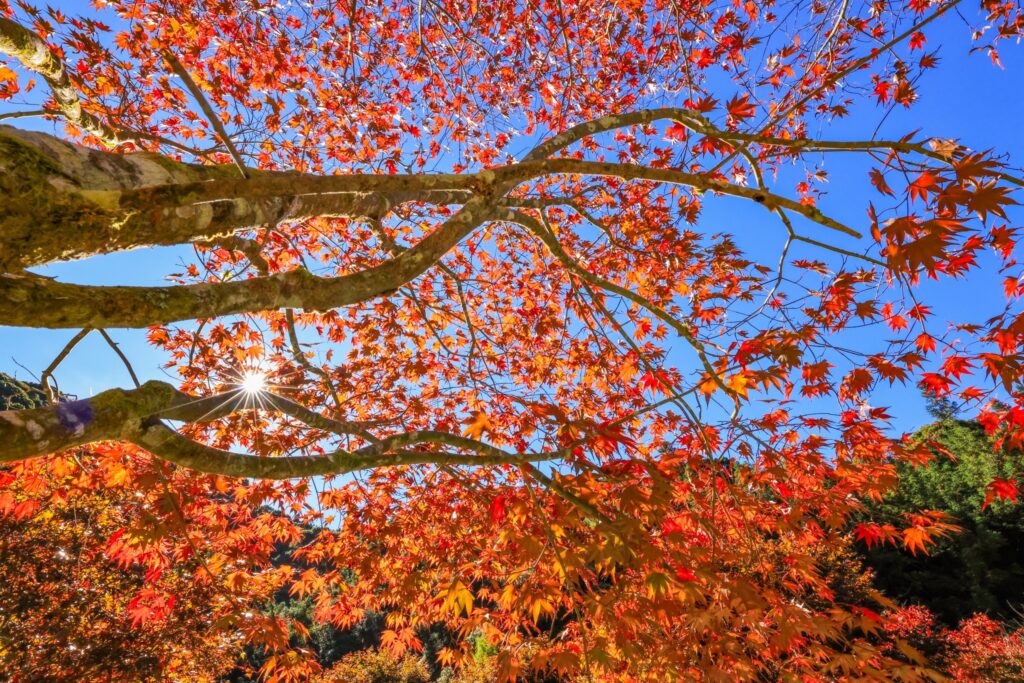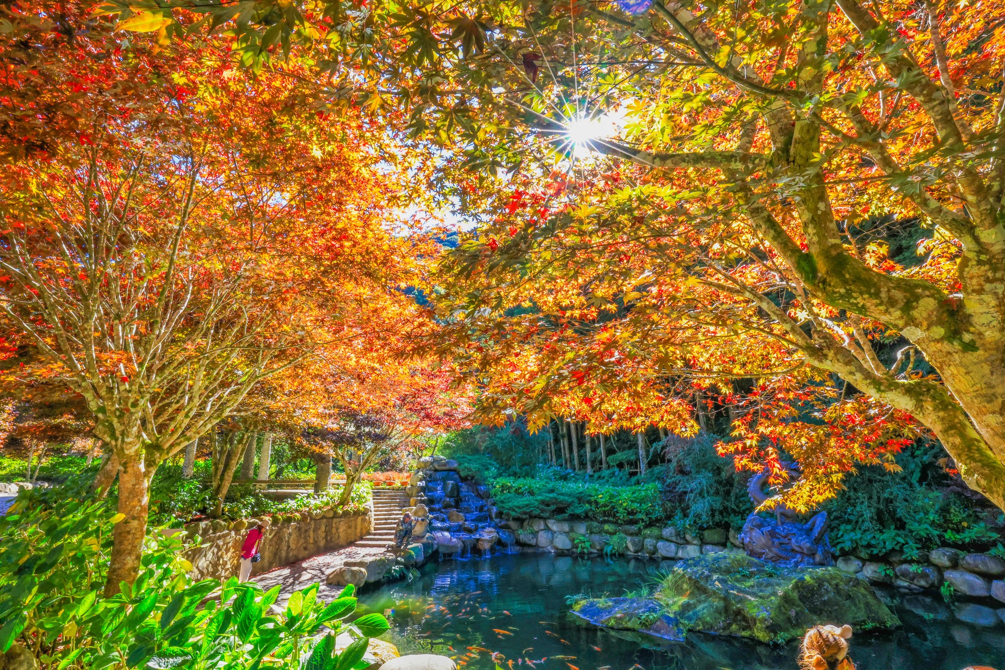 杉林溪森林生態渡假園區花卉中心附近的日月池區域,可欣賞橘紅色的楓葉。圖/杉林溪提供