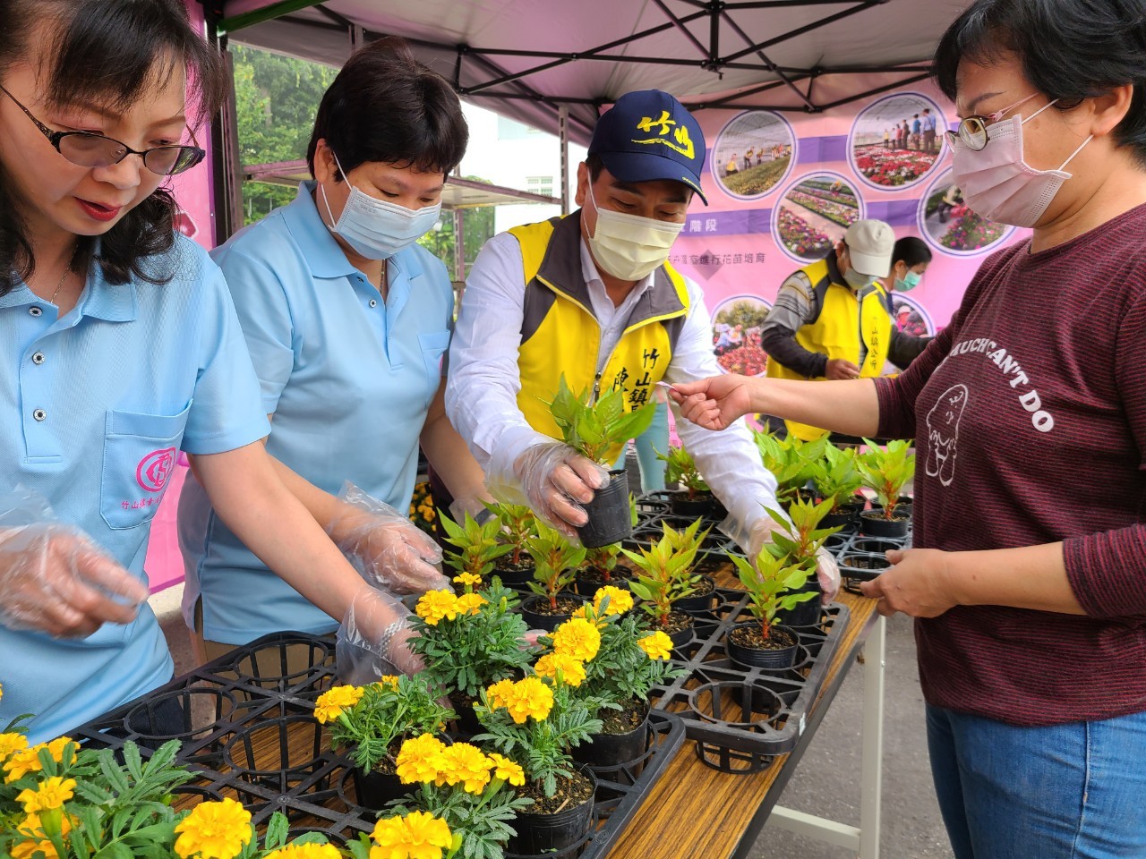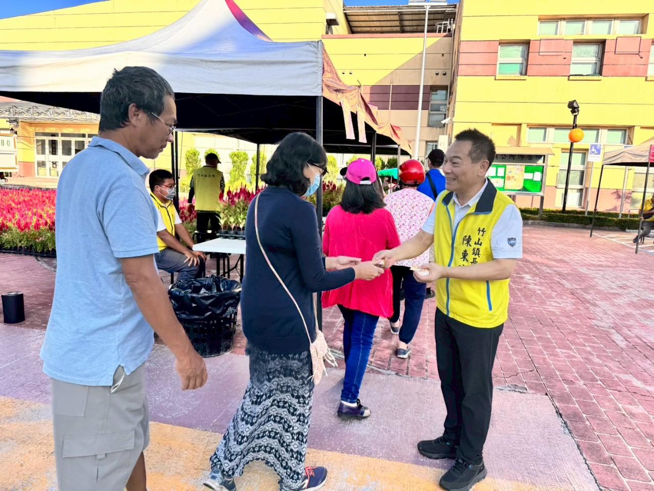 竹山鎮公所六年前就開始配合中央及南投縣政府政策,將廚餘變種花有機肥培育出大量的各種草花,每個月最後一個周六送鎮民拿回家美化庭園,鎮長陳東睦親自發送草花兌換券。圖/竹山鎮公所提供