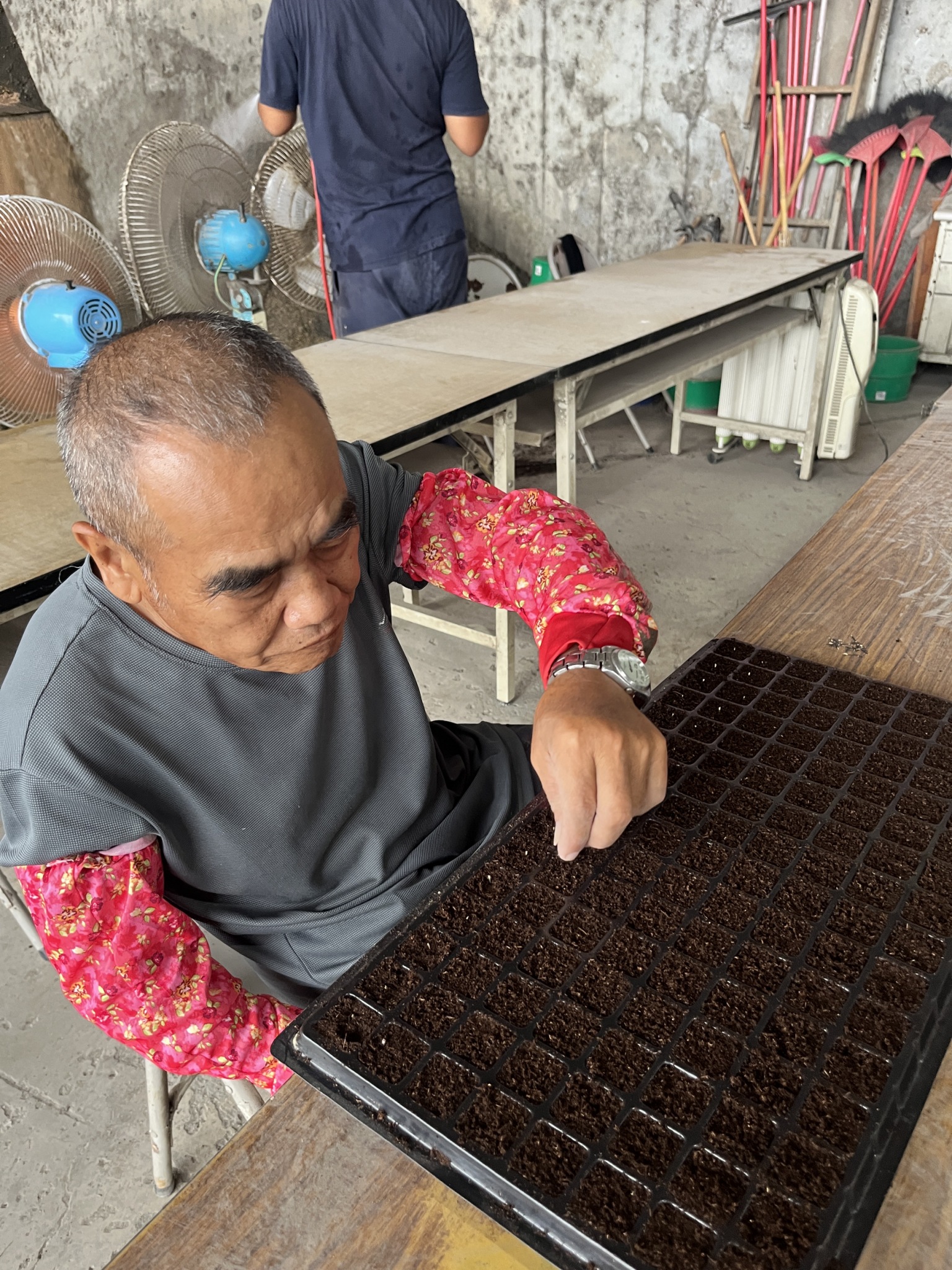 回收的廚餘融合木屑土壤等介質產生化學變化變有機土壤 兩公頃多的基地搭建溫室與花圃,雇用以工代賑人力培育花苗 1年可培育出100萬株花苗 美化庭院還做公共空間美化