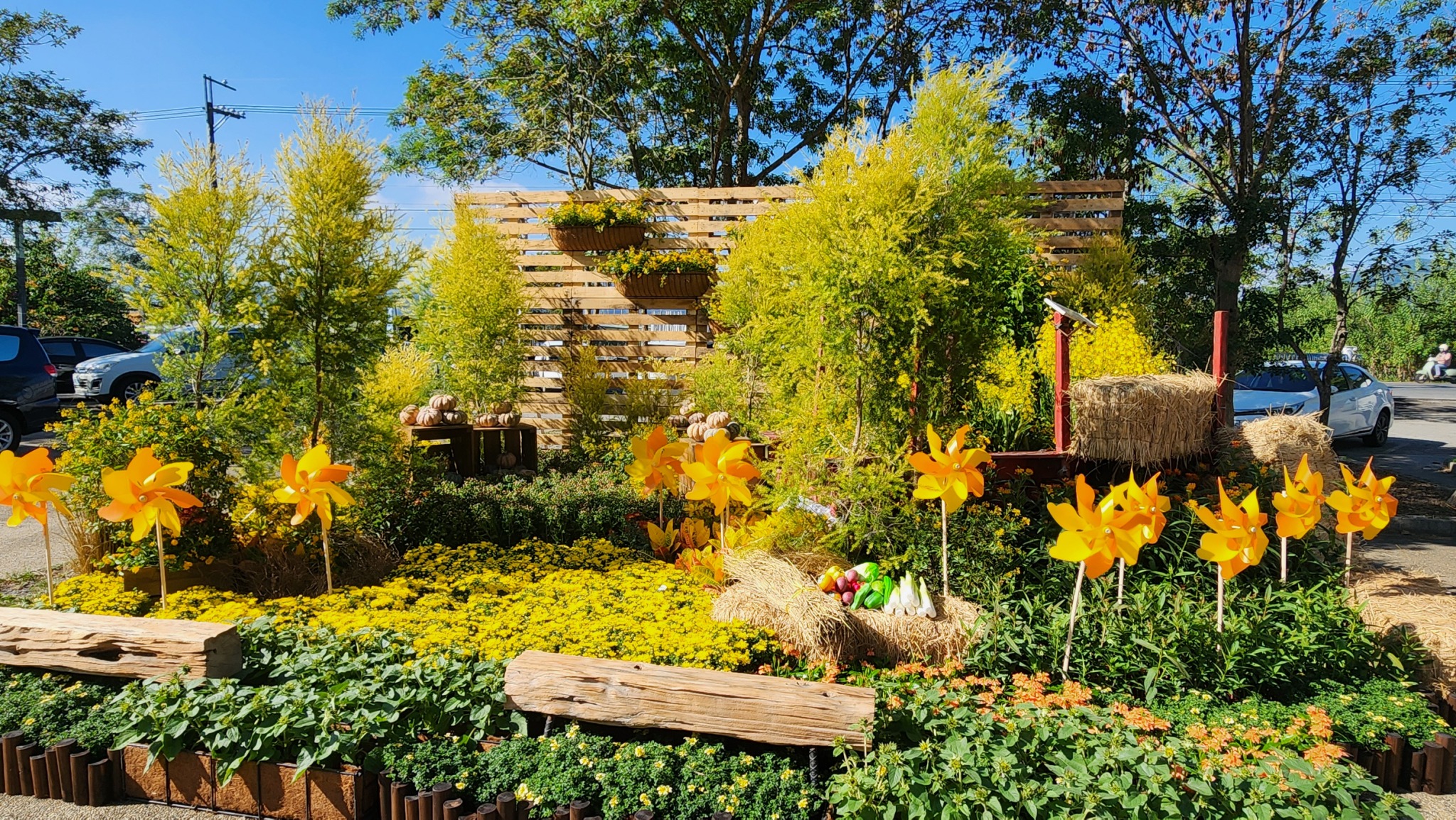 第一展區埔里花卉暨多功能農特產中心,打造埔里山景與農村風光至蝴蝶之鄉四大特色地景創作花藝區。圖/埔里鎮公所提供