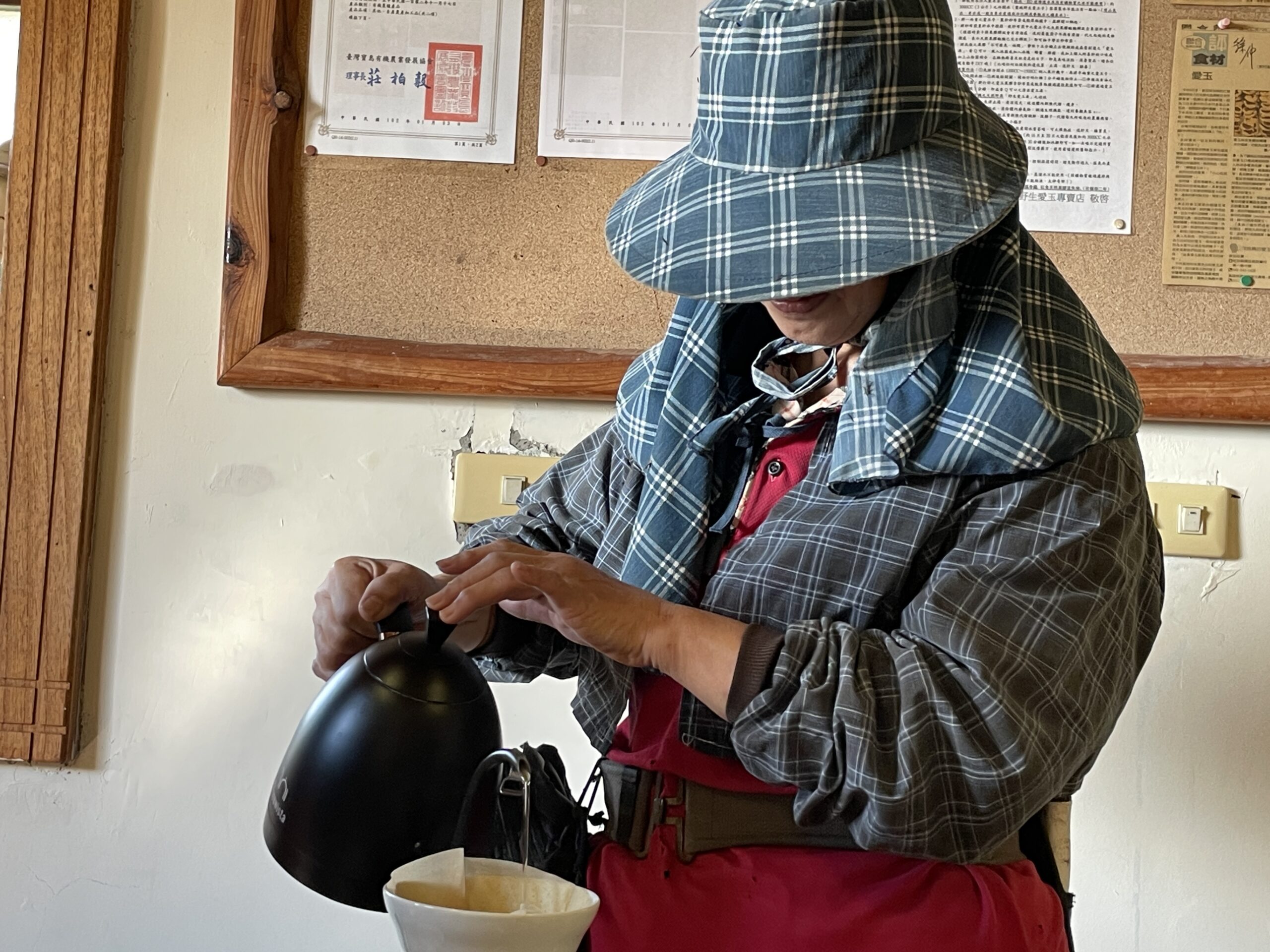 蔡潘阿嬤的女兒幫媽媽沖泡咖啡待客。