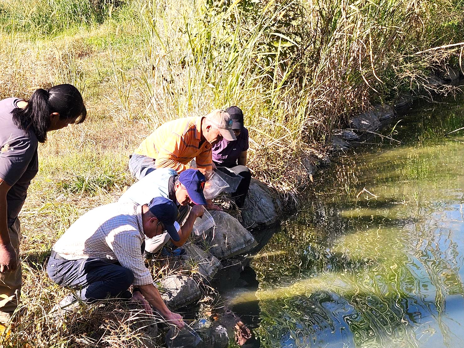會後相關單位一起將今年加入庇護系統的德安教養院生態池自然繁殖巴氏銀鮈個體放流至眉溪水池 展現跨域合作推動保育的決心