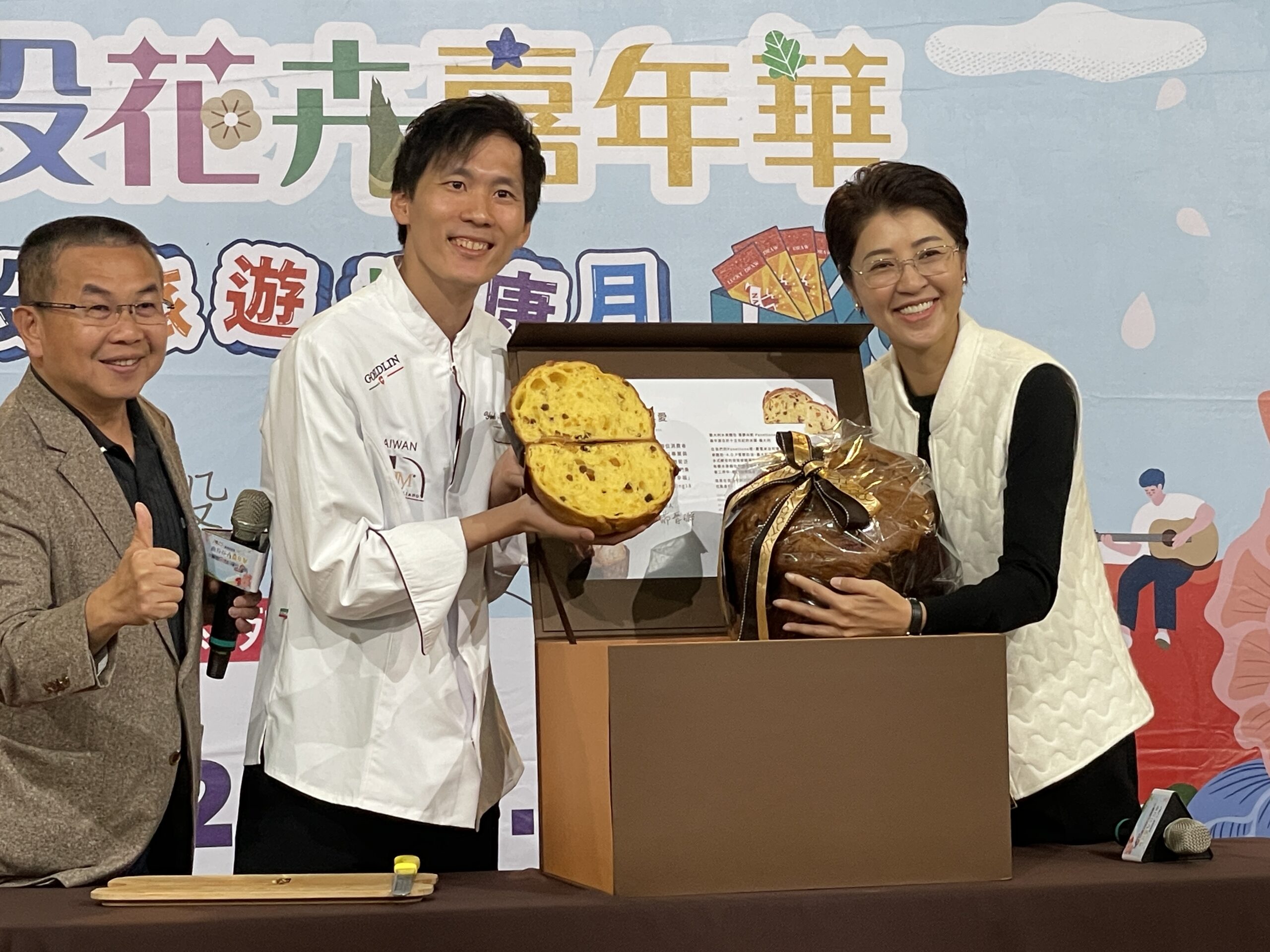Feeling18創辦人茆晉(日牂)帶來台灣高鐵商務艙指定點心—可可椪柑蛋糕與世界盃聖誕麵包大賽奪得總冠軍的水果麵包潘那朵尼分享,許縣長感謝Feeling18長期投入地方,以高品質烘焙結合在地花果香氣,讓花卉嘉年華增添更多亮點。