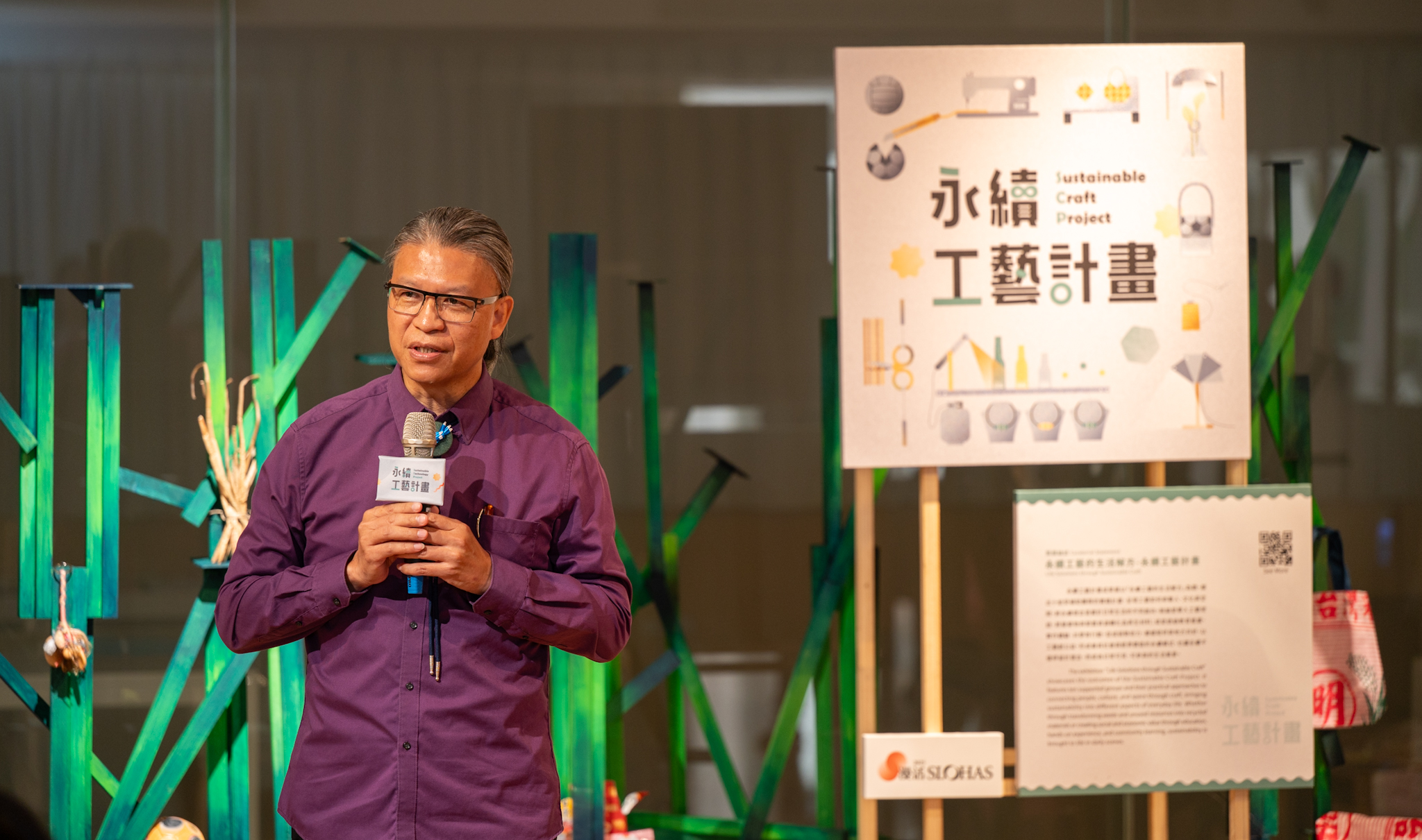這是中心自2023年啟動「循環工藝計畫!」以材料再生、設計創新與跨域合作為起點,探索工藝循環利用的多種可能。2024年進一步推展為「永續工藝計畫」,呼應聯合國永續發展目標(SDGs),聚焦「永續行旅」、「永續教育」、「健康與福祉」及「責任消費與生產」四大議題,邀請多個團隊以不同形式示範並實踐永續理念,計畫涵蓋社頭織襪產業為題的永續小旅行策劃,從地方產業轉譯文化深度;以手作療癒連結弱勢群體與婦女賦權展開關懷行動;以廢棄匾額再生為家飾裝置,賦予舊物新生與故事;或推動青銀共學,讓不同世代在工藝中展開深度對話。這些行動讓工藝真正走入社會不同層面與生活日常的永續網絡。