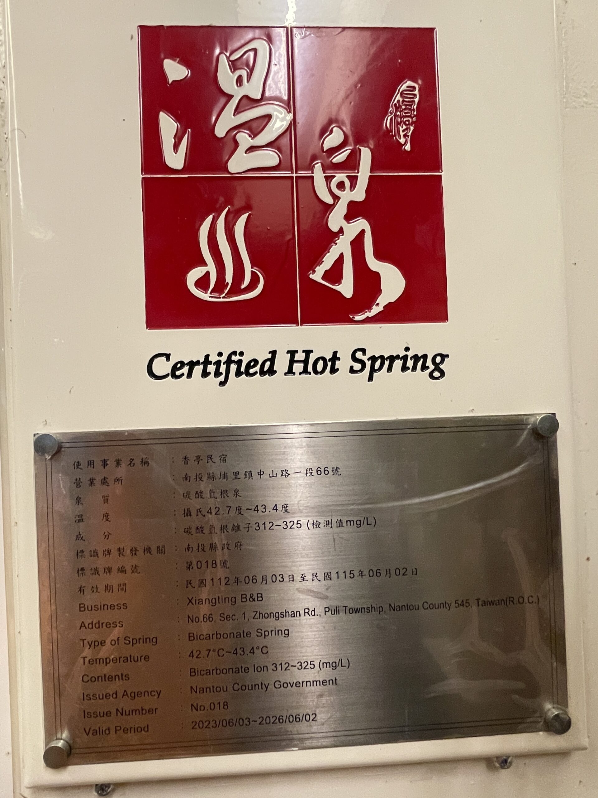 埔里溫泉標準章只有三家,香亭溫泉會館就是其中之一,地方文史工作者潘樵老師說,這是縣府於112年核發標準溫泉標章,政府認定屬碳酸氫根泉!水溫在攝氏42.7-43.4。C,南投縣第18號溫泉標章、一年查核三次,難能可貴的是香亭前方緊鄰觀音瀑帶,往仁愛方向走約五分鐘拐進右方小巷就是通往彩蝶瀑布羊腸小徑! 喜歡溫泉瀑布的遊客,香亭會是不錯的選擇!