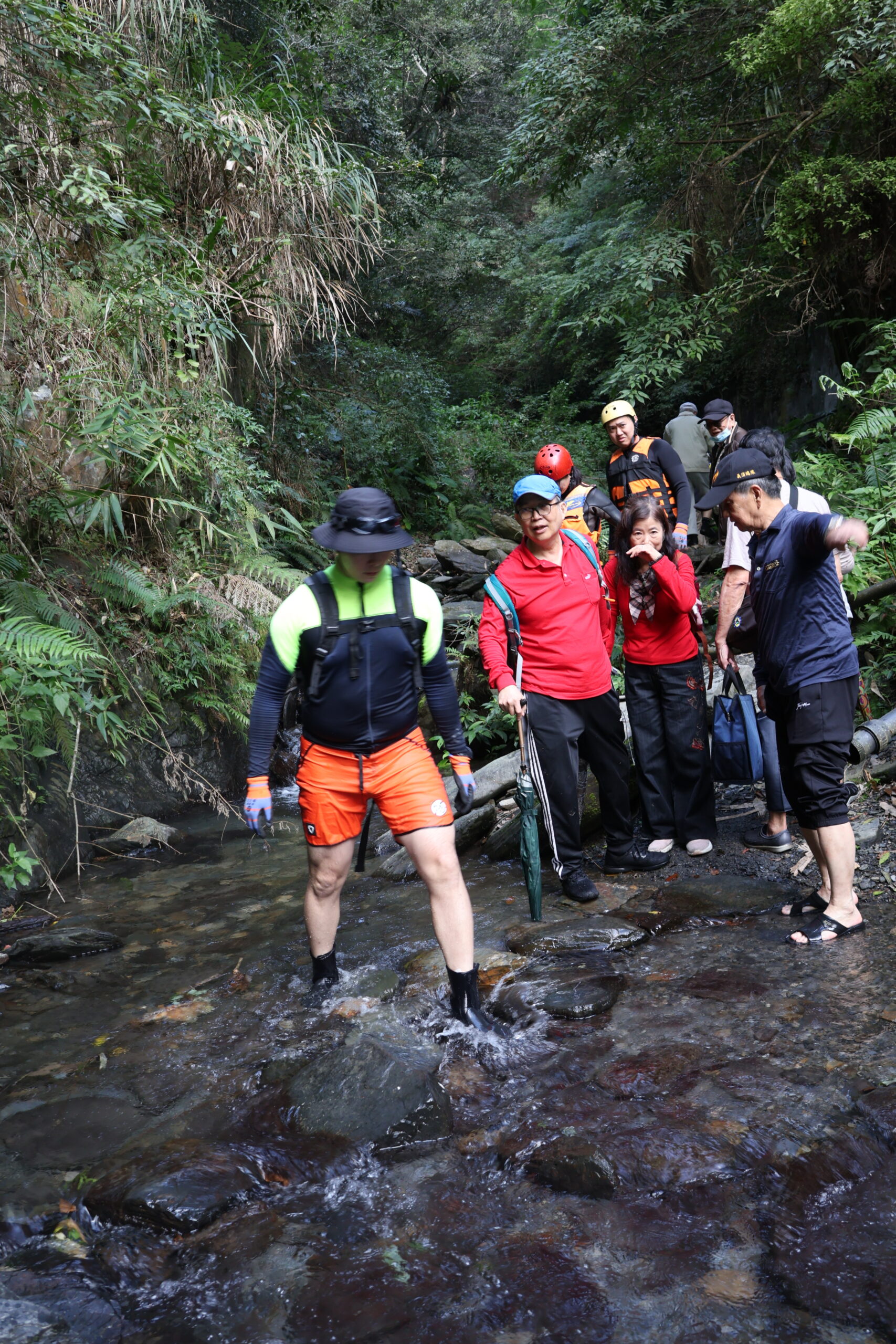 車輛駛過香亭約五百公尺右轉踏上挑戰型彩蝶瀑布便道,小編與遊客在地方文史工作者樵老師帶路下,穿著雨鞋沿著小徑穿越草叢樹林與岩石,穿梭於溪流便道間,沿途還有多處陡峭小路設有攀登繩索,一路攀越而上,溪流淙淙超清涼,走約45分鐘抵達壯闊雄偉的彩蝶瀑布,流了一身汗拍照到此一遊,再折返溫泉民宿,好好的泡個碳酸氫根泉滌盡一身汗味,整個人為之清爽,再到餐廳享用鄉土料理。