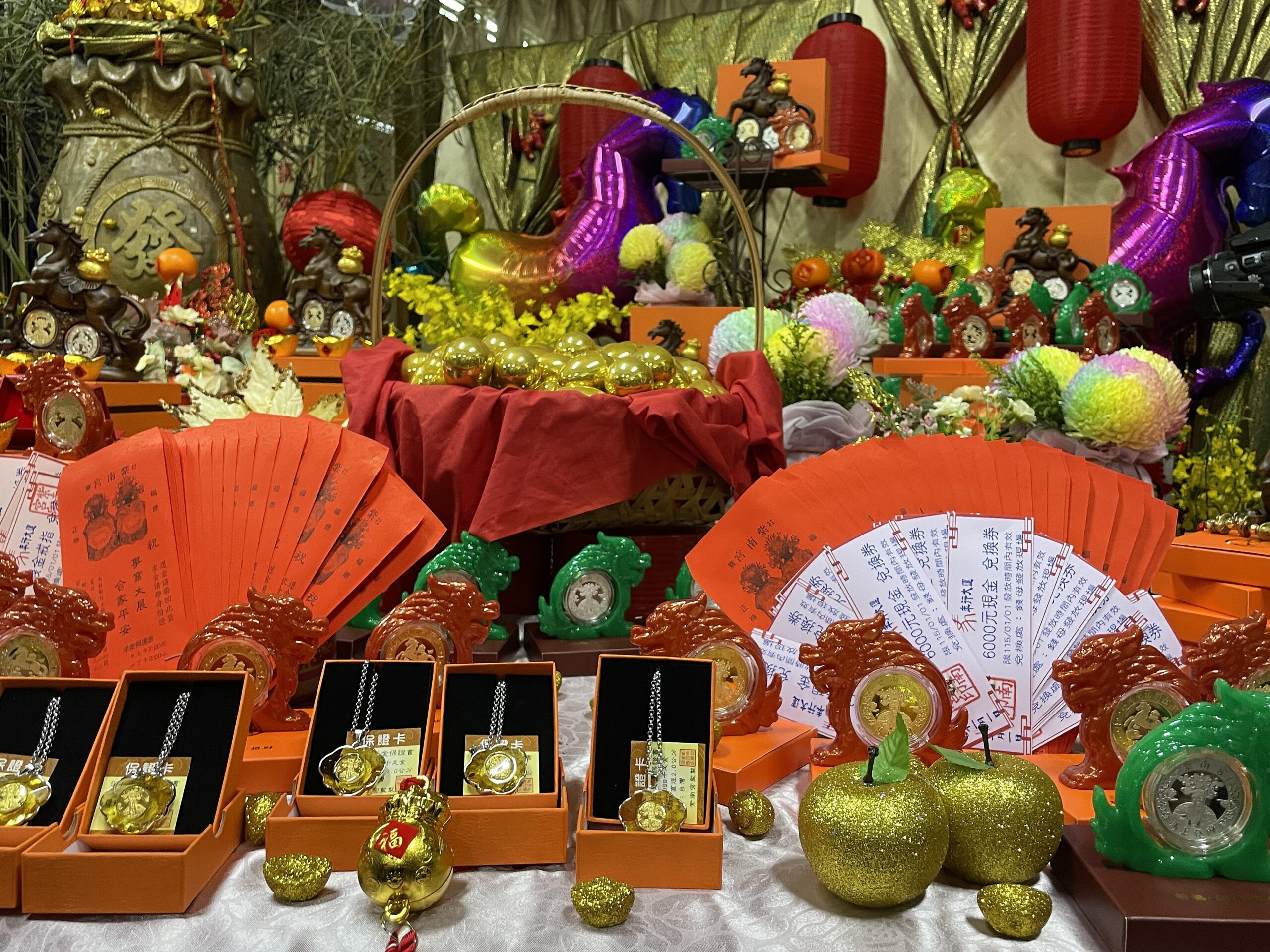 每年元旦是紫南宮送福氣錢母的日子,2026年適逢十二生肖中丙午馬年,代表馬上發財正式登場;主委莊秋安說,竹山紫南宮丙午馬年錢母,分為金色錢母、銀色錢母、典藏金銀錢母套幣及錢母項鍊,錢母雙面分別刻有土地公神像搭配文字「馬上發財」,另一面是攜帶聚寶盆的駿馬搭文字「馬到成功開新運」,單枚錢母則是招財打造神獸貔貅造型,馬年套幣則是以手工製仿木紋駿馬載著「馬上發財」聚寶盆,包裝外盒「致敬」國際品牌愛馬仕橘。