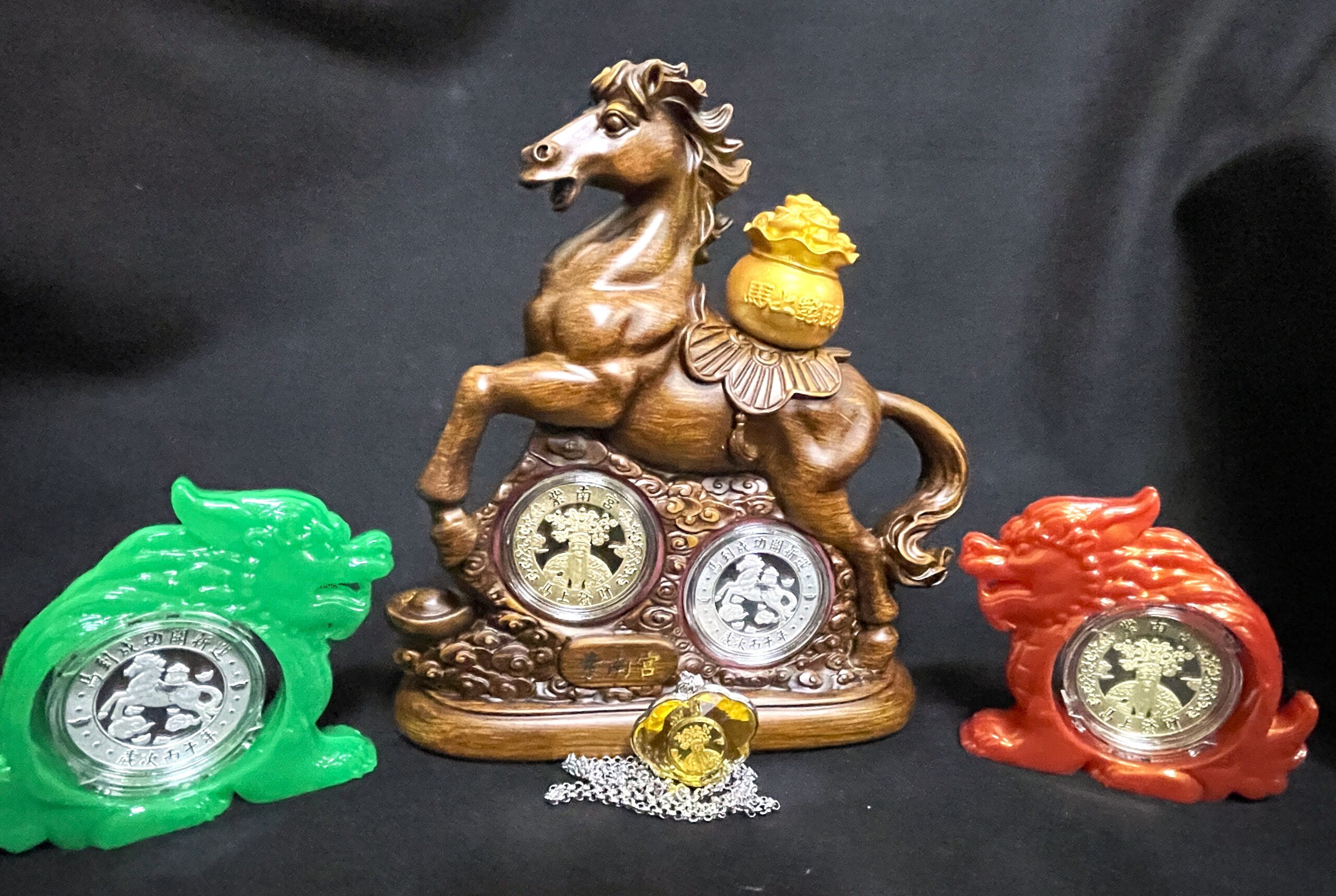 紫南宮主委說丙午馬年錢母 分金色錢母 銀色錢母 典藏金銀錢母套幣及錢母項鍊 套幣錢母兩面刻有土地公神像搭配馬上發財文字 另一面駿馬攜帶聚寶盆搭配馬到成功開新運文字