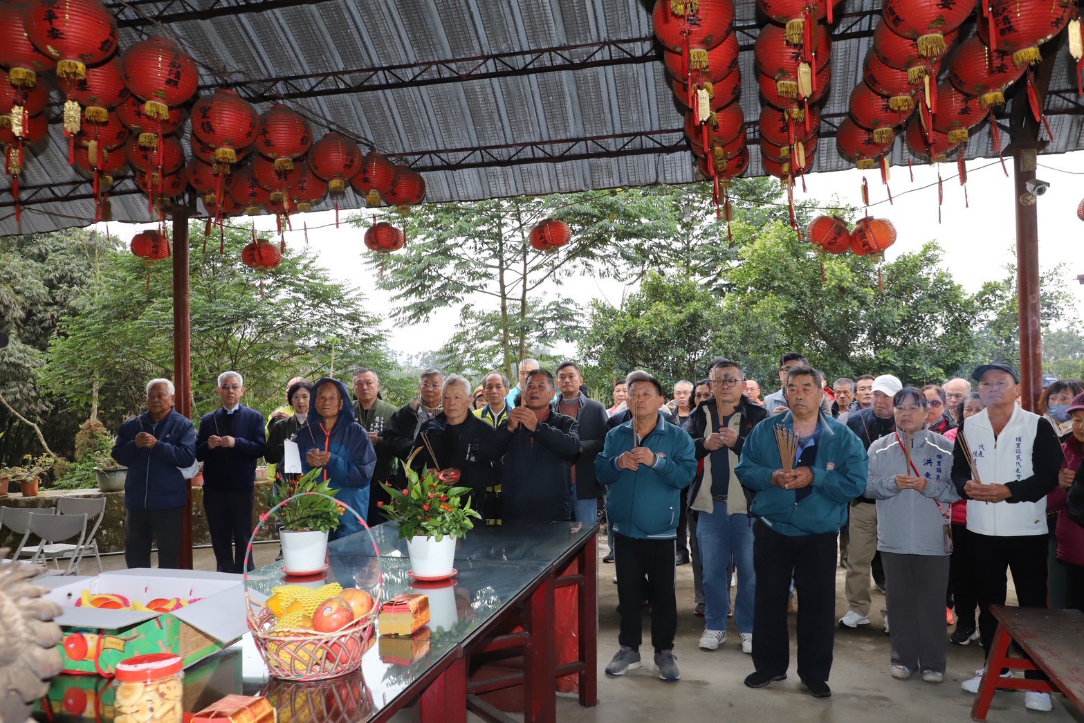 與會代表參拜天仙宮玄天上帝,祈求神明賜給力量,助鄉親抗爭成功,讓業者撤案。圖/反對埔里設置廢棄物掩埋場大聯盟提供