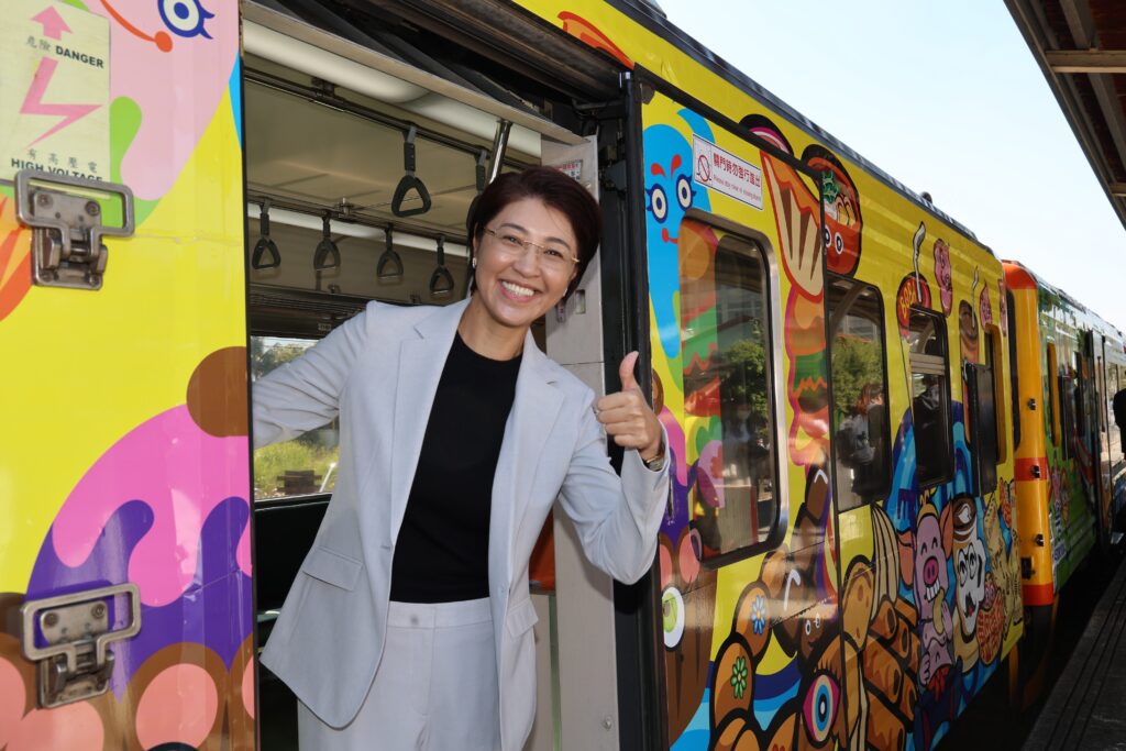 藝術家洪易更到場解說以其「西遊記」創作結合集集特產山蕉美食、保育類石虎及南投山色,打造宛如「行走的藝術品」的彩繪列車精髓。圖/集集鎮公所提供