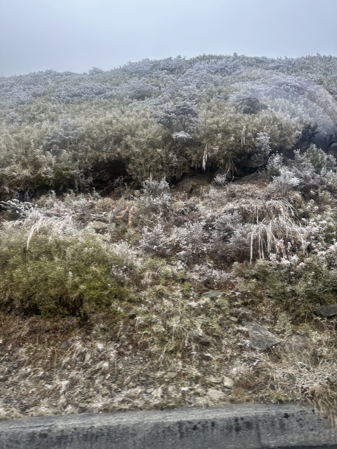 在峰翠山區種茶的柯太太今天一早陪同另一半、朋友要去茶園看看,在昆陽休息區就遇見天降冰霰接著雪霰交加,雪花飄天隨風飄搖再落地,她說,雪霰交織的場景還是第一次看見,竟是那麼的優雅且美麗,山頭舖上一層薄薄的雪花,針葉樹變霧淞挺立於山中,雪霰降到地面變冰晶閃閃發亮,氣溫一直在零下二至三度間,合歡山變銀妝世界,那氛圍真是讓人著迷。