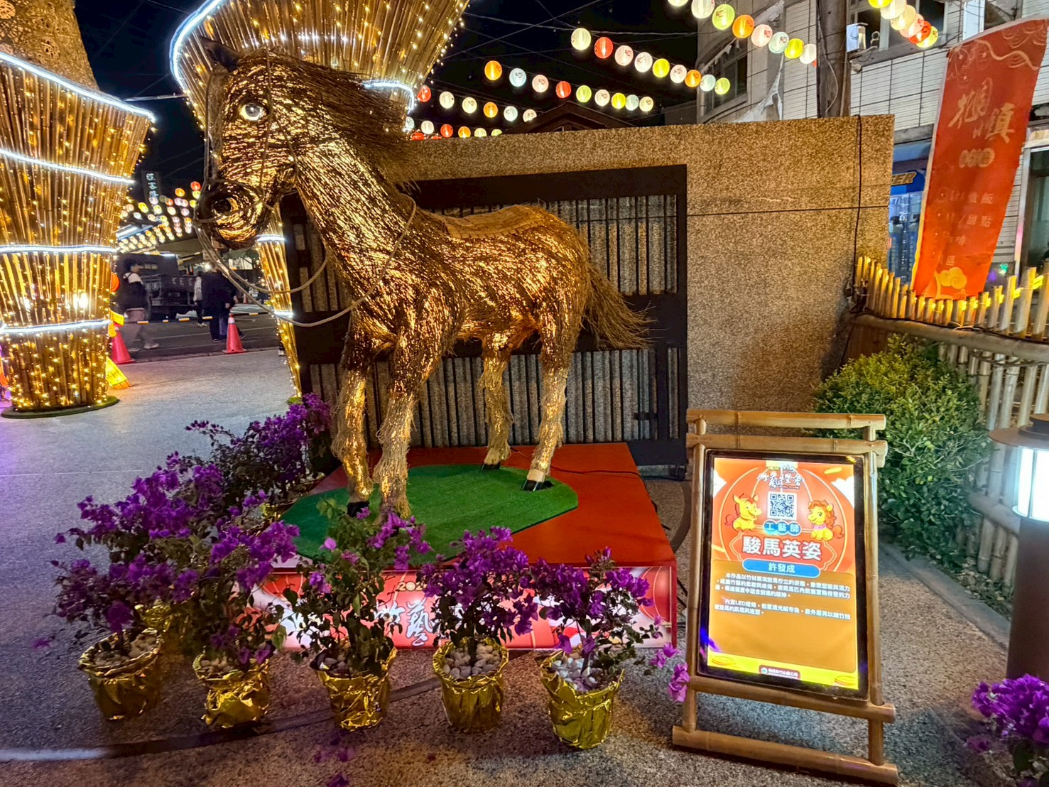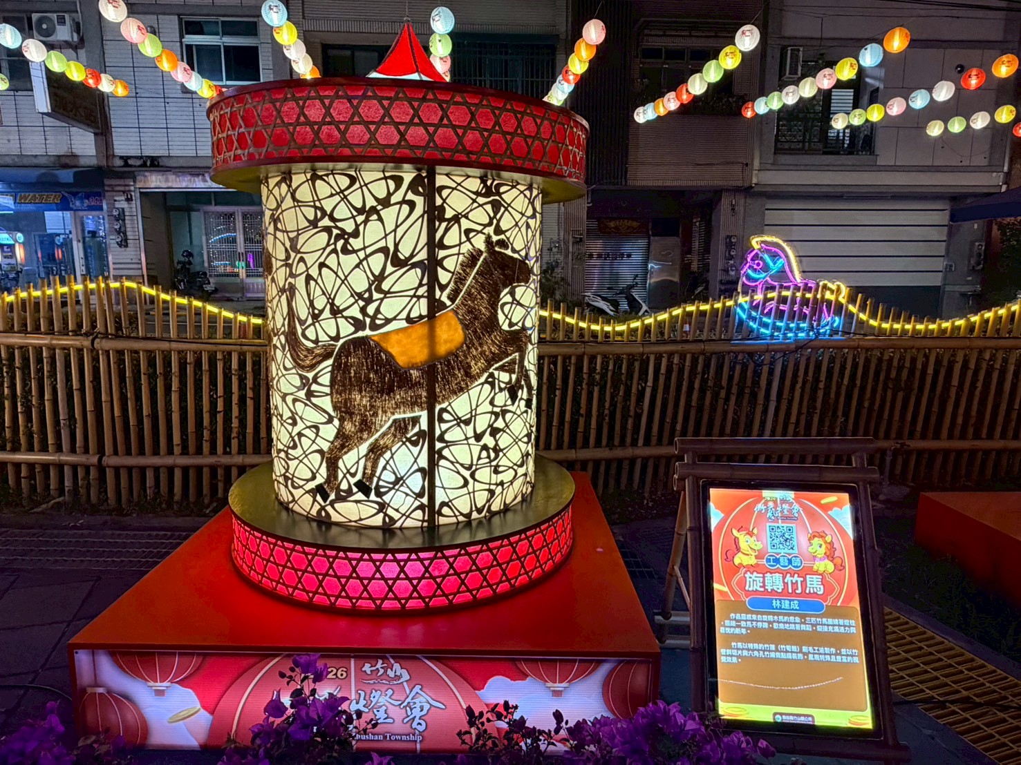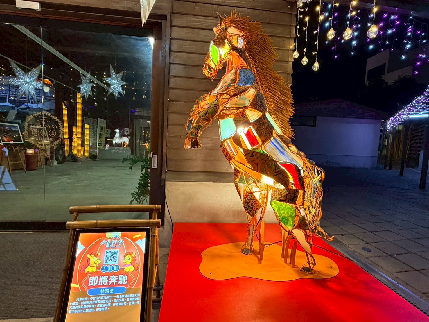 紫南宮贊助主燈 邀竹藝大師邱錦鍛操刀馬身結構採傳統花燈骨架鑲嵌竹編藝術 運用「六角穿花」、「輪口編」與「六角穿風車編」等傳統工法 精準勾勒出馬匹的動能與肌理張力 周邊邀林芳仕老師以手工打造夢幻彩色琉璃鑲嵌藝術
