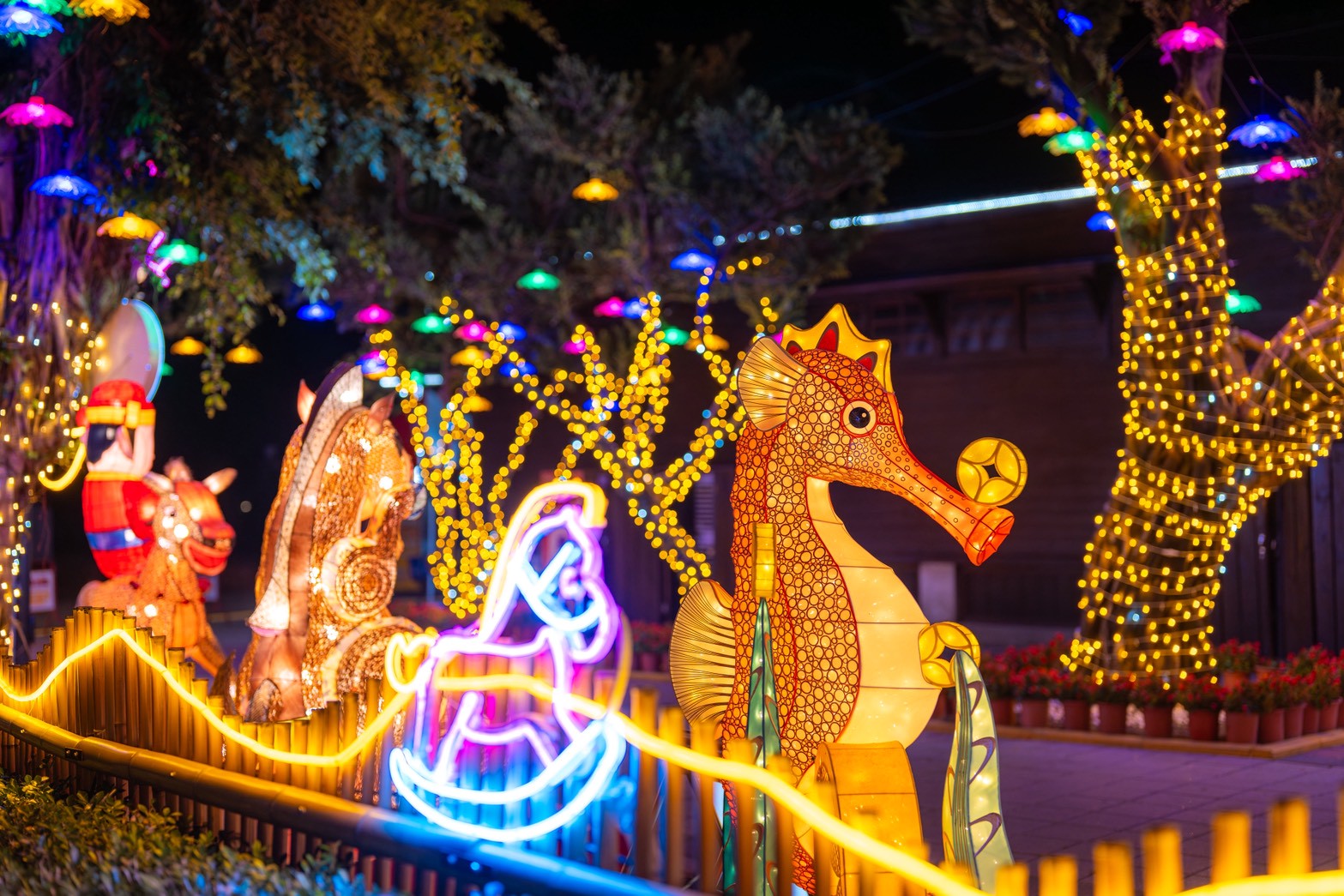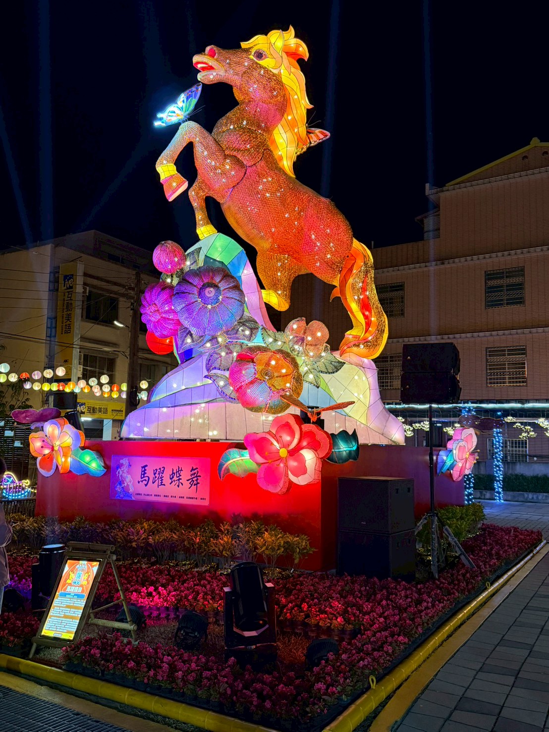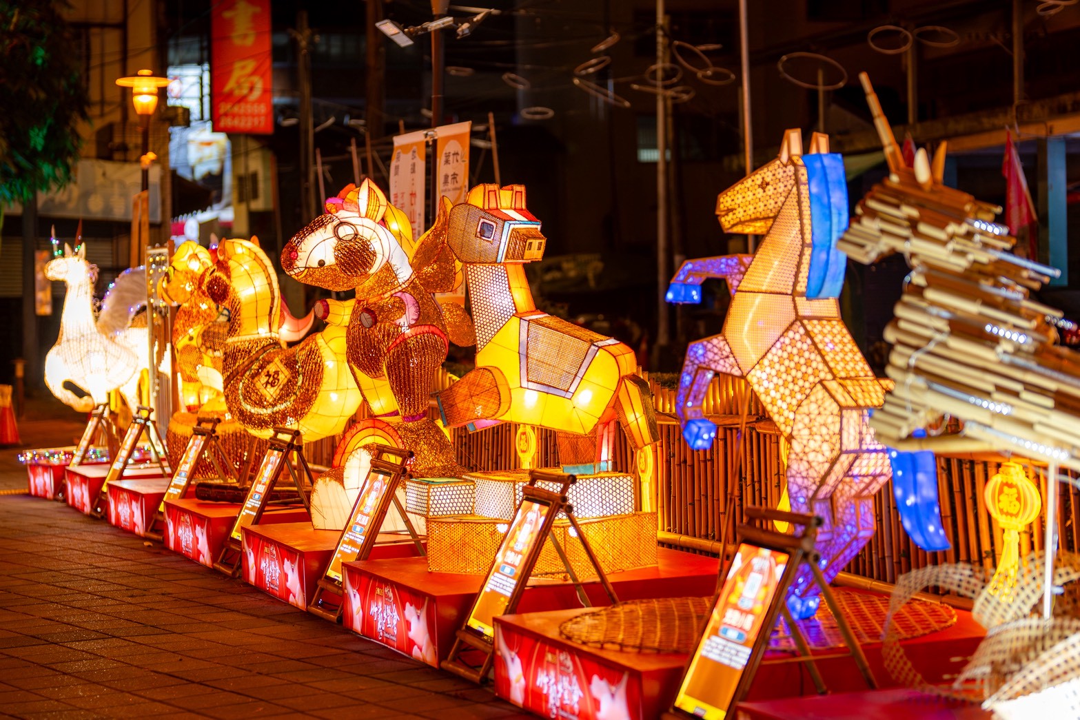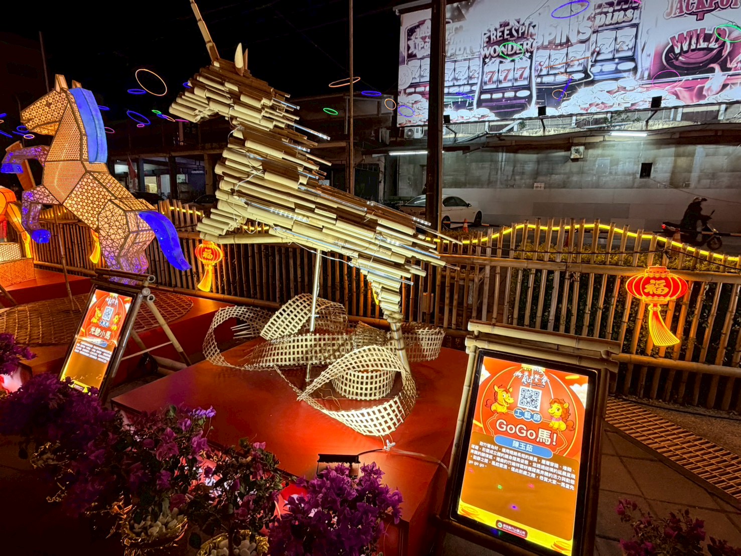紫南宮贊助主燈 邀竹藝大師邱錦鍛操刀馬身結構採傳統花燈骨架鑲嵌竹編藝術 運用「六角穿花」、「輪口編」與「六角穿風車編」等傳統工法 精準勾勒出馬匹的動能與肌理張力 周邊邀林芳仕老師以手工打造夢幻彩色琉璃鑲嵌藝術