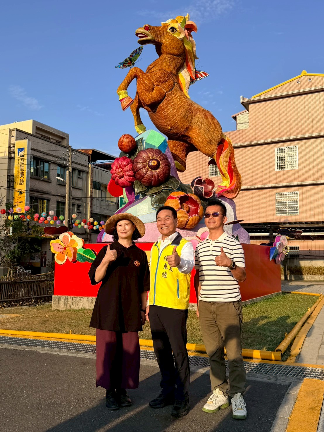 今年燈會最大特色?陳東睦鎮長說,本次主燈「馬躍蝶舞」特邀知名竹藝大師邱錦緞親自操刀,馬身結構採傳統花燈骨架鑲嵌竹編藝術,並運用「六角穿花」、「輪口編」與「六角穿風車編」等傳統工法,精準勾勒出馬匹的動勢與肌理張力,充分展現工藝師的匠心巧手。主燈周圍以紫斑蝶點綴其中,蝶翼選用絨布質感,並鑲嵌地方知名的林芳仕老師手工彩色琉璃鑲嵌設計,於陽光下折射出由淡紫漸變至亮藍的夢幻色澤,傳遞守護家園、珍愛生態的竹山精神;竹山鎮公所也特別感謝紫南宮全力贊助,成就這座融合工藝之美與在地精神的精湛之作。