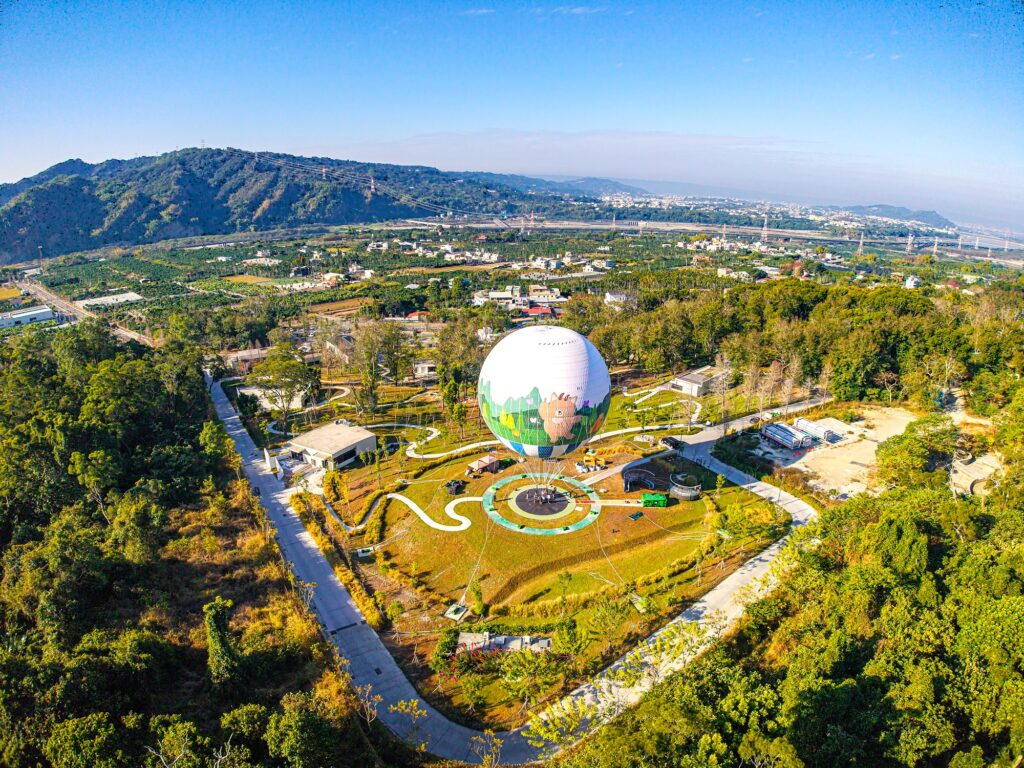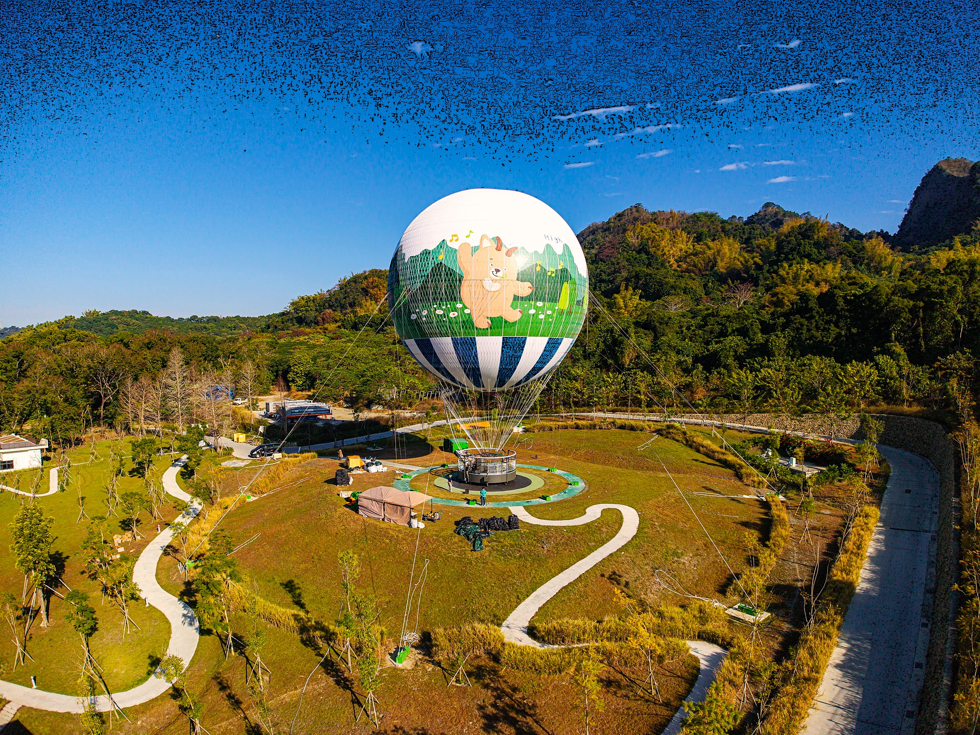 亞洲第三座氦氣球樂園引進由法國專業氦氣球製造商Aerophile所設計與製作最新型繫留式氦氣球,升空至150公尺高,相當於在50層樓高居高臨下俯瞰欣賞九九峰山巒、鳥嘴潭人工湖等美景。圖/南投縣府提供