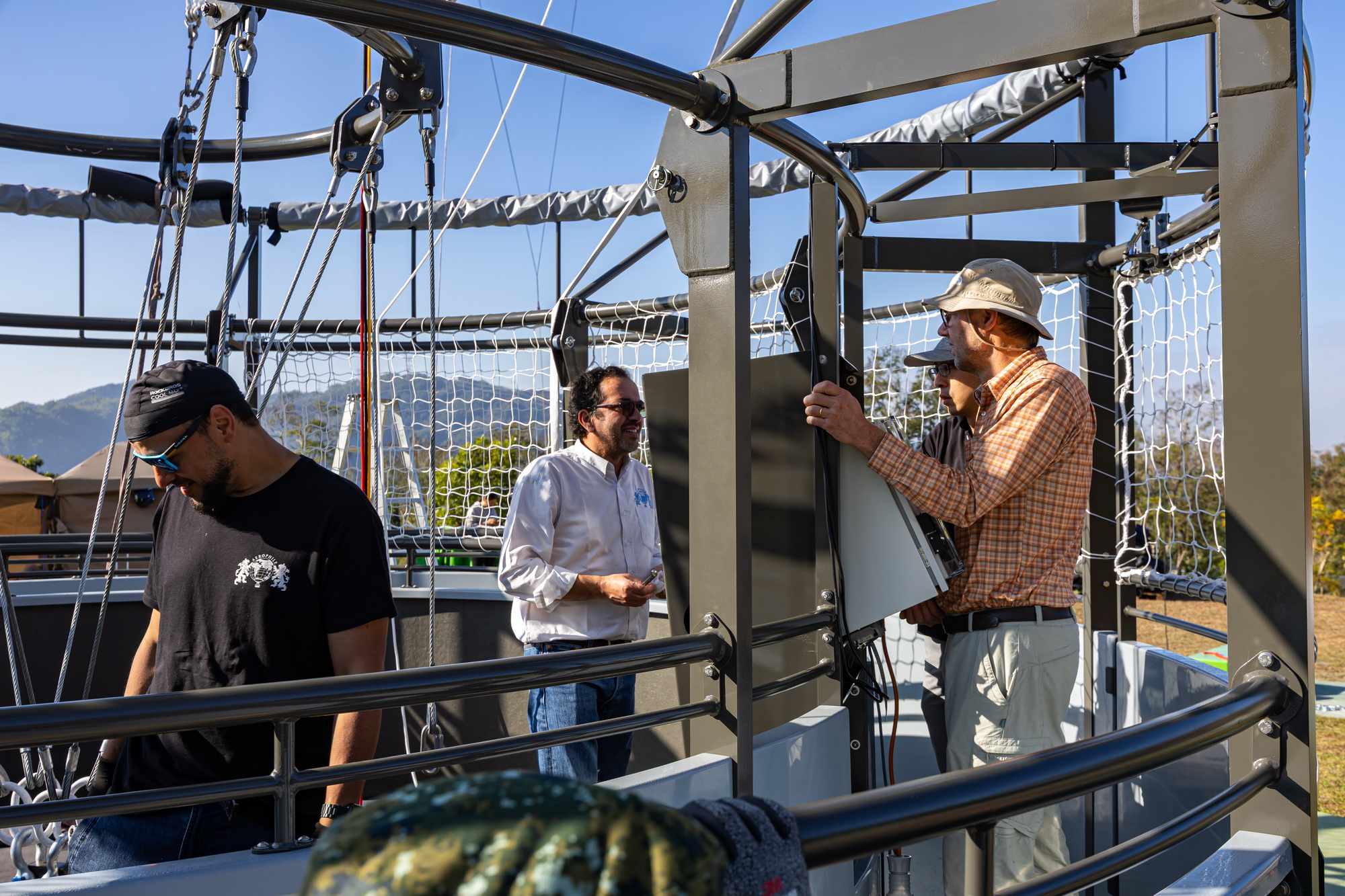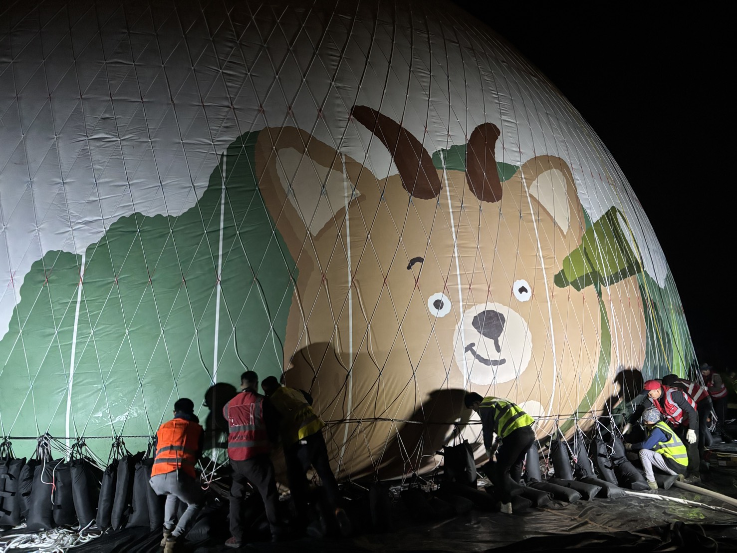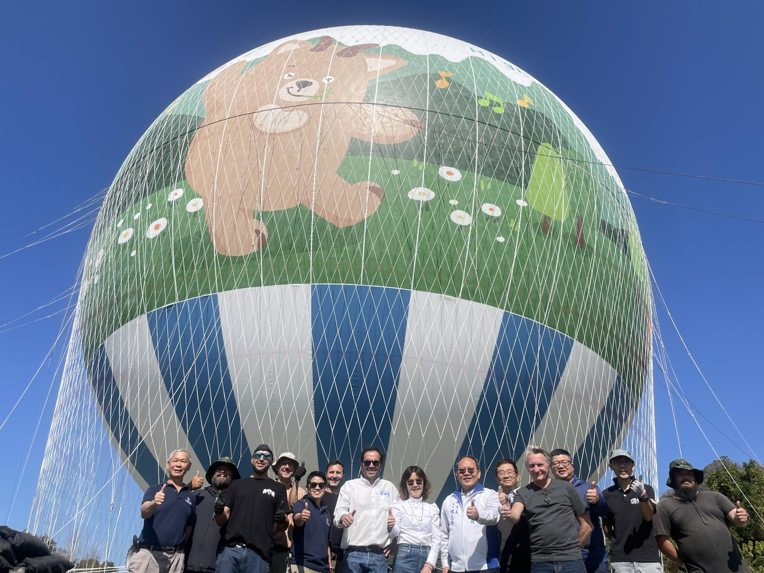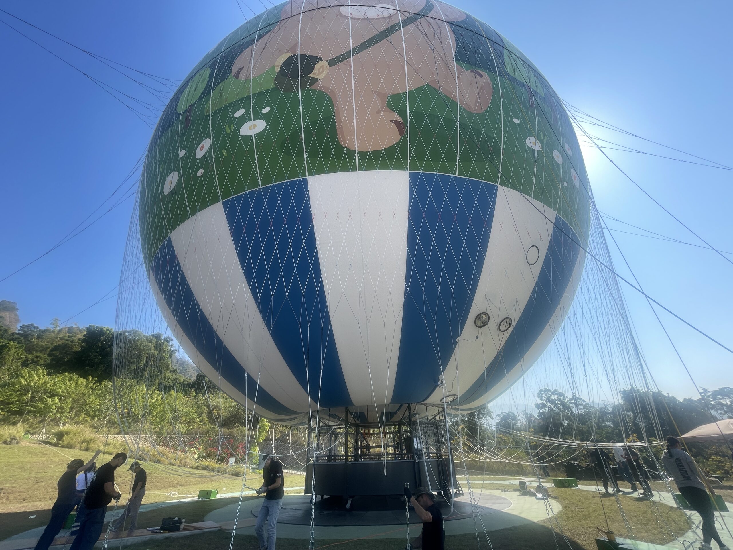九九峰氦氣球樂園的核心設施球體規模達6,000立方公尺,搭配專用主機設備與多重安全控制系統,以繫留方式進行升降操作,風速穩定情況下每次可搭乘最多30人,組裝團隊合影。