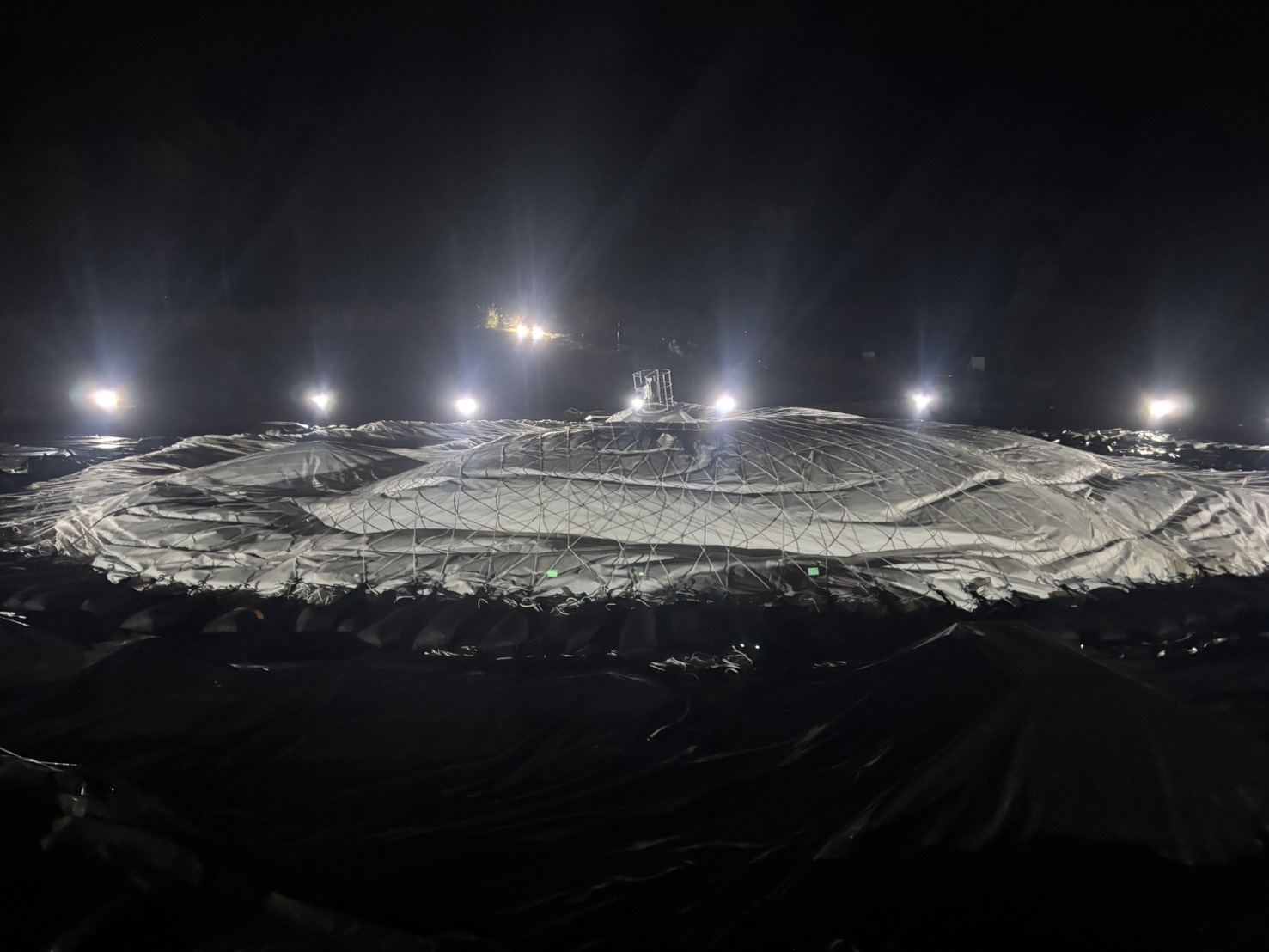 氦氣球設施於27日完成組裝機電控制室、飛行平台及絞鍊等地面設施,27日晚間完成氦氣充填作業現場。圖/南投縣政府提供