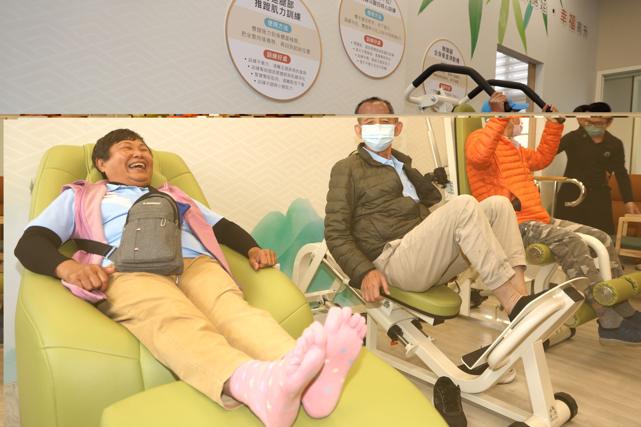 前山基金會及竹山秀傳醫院合作成立的「竹山竹秀苑社區長照機構」30日舉辦盛大開幕典禮,這不僅是前山基金會繼名間鄉後打造的第二家日照中心,補足了竹山「一學區一日照」的資源,長輩快樂使用設備。圖/南投縣政府提供