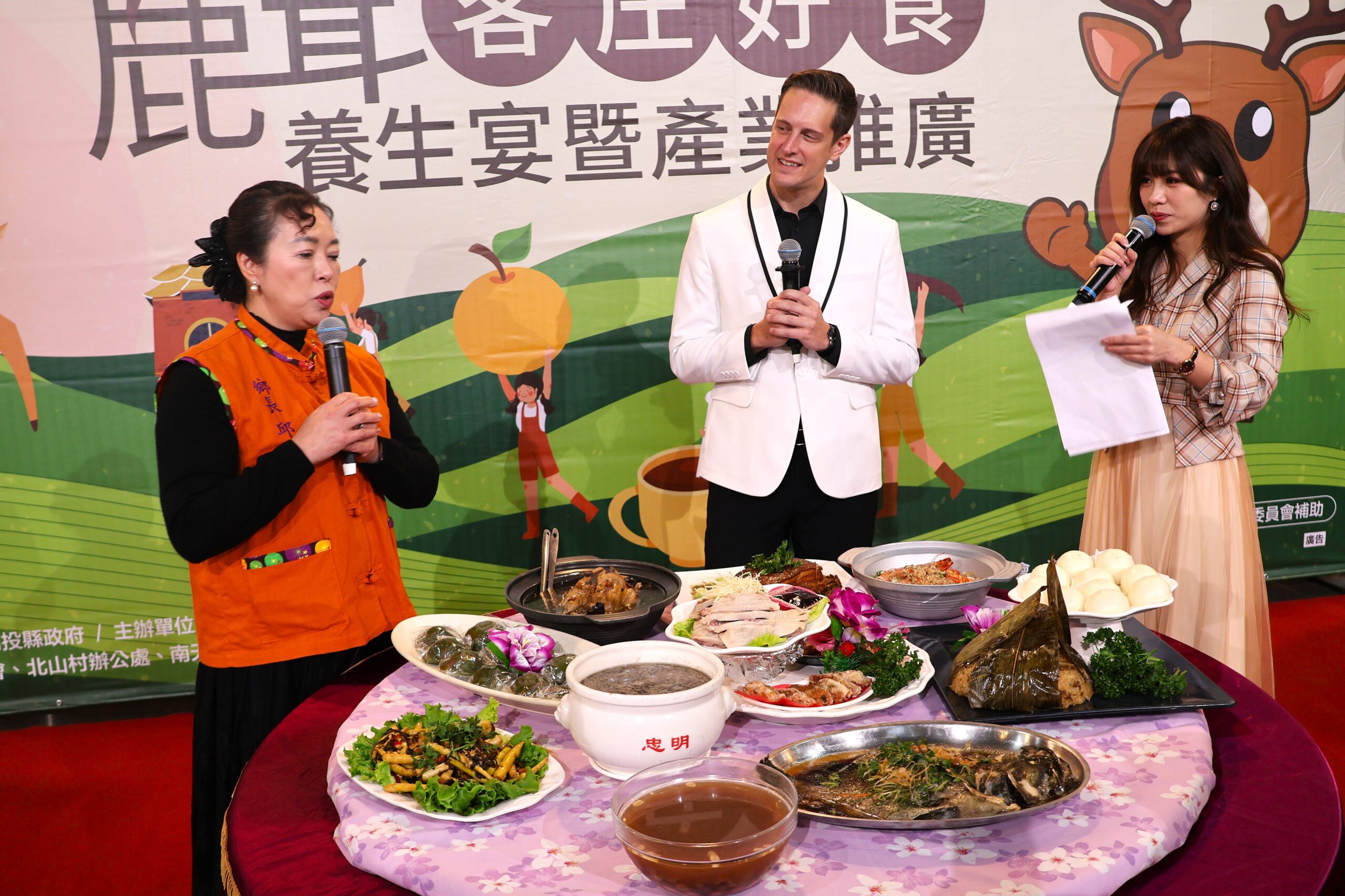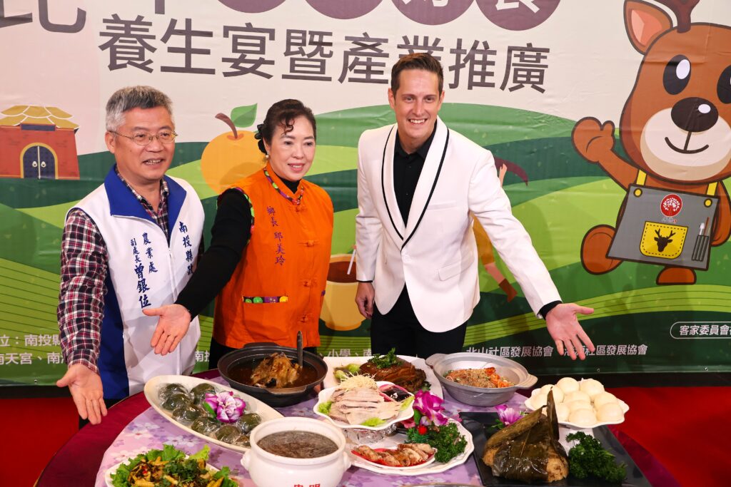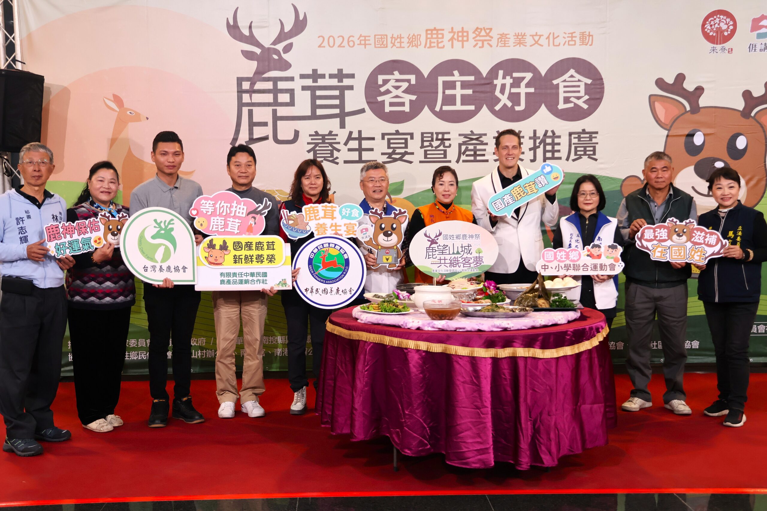 國姓鄉公所2/10日在縣府舉辦「2026國姓鹿神祭產業文化活動」系列首場活動—「客庄好食.鹿茸養生宴推廣會,為年度盛會揭開序幕,縣府農業處副處長曾銀位與鄉長邱美玲.從美來台發展的藝人賈斯丁等一起推荐精緻養生宴席。