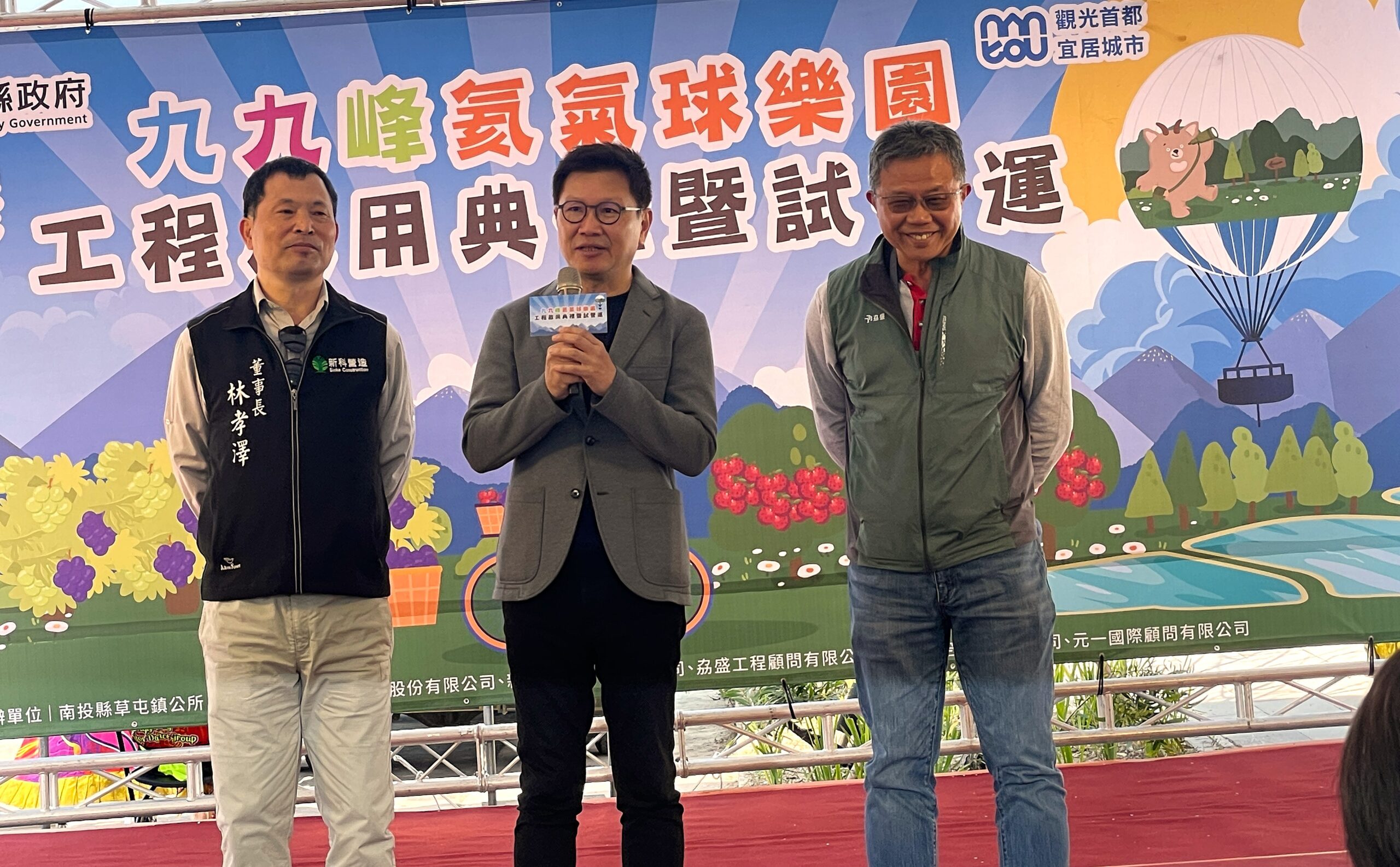 九九峰氦氣球樂園11日吉時揭牌啟用暨試營運活動,許淑華偕立法院副院長江啟臣及立委馬文君、游顥、草屯鎮長簡賜勝等人率先體驗氦氣球,空風力稍大,僅限10人搭乘,氦氣球升至168公尺高處,許縣長等沿著吊籃環視九九峰至草屯360度美景,讓人倍覺心曠神怡。