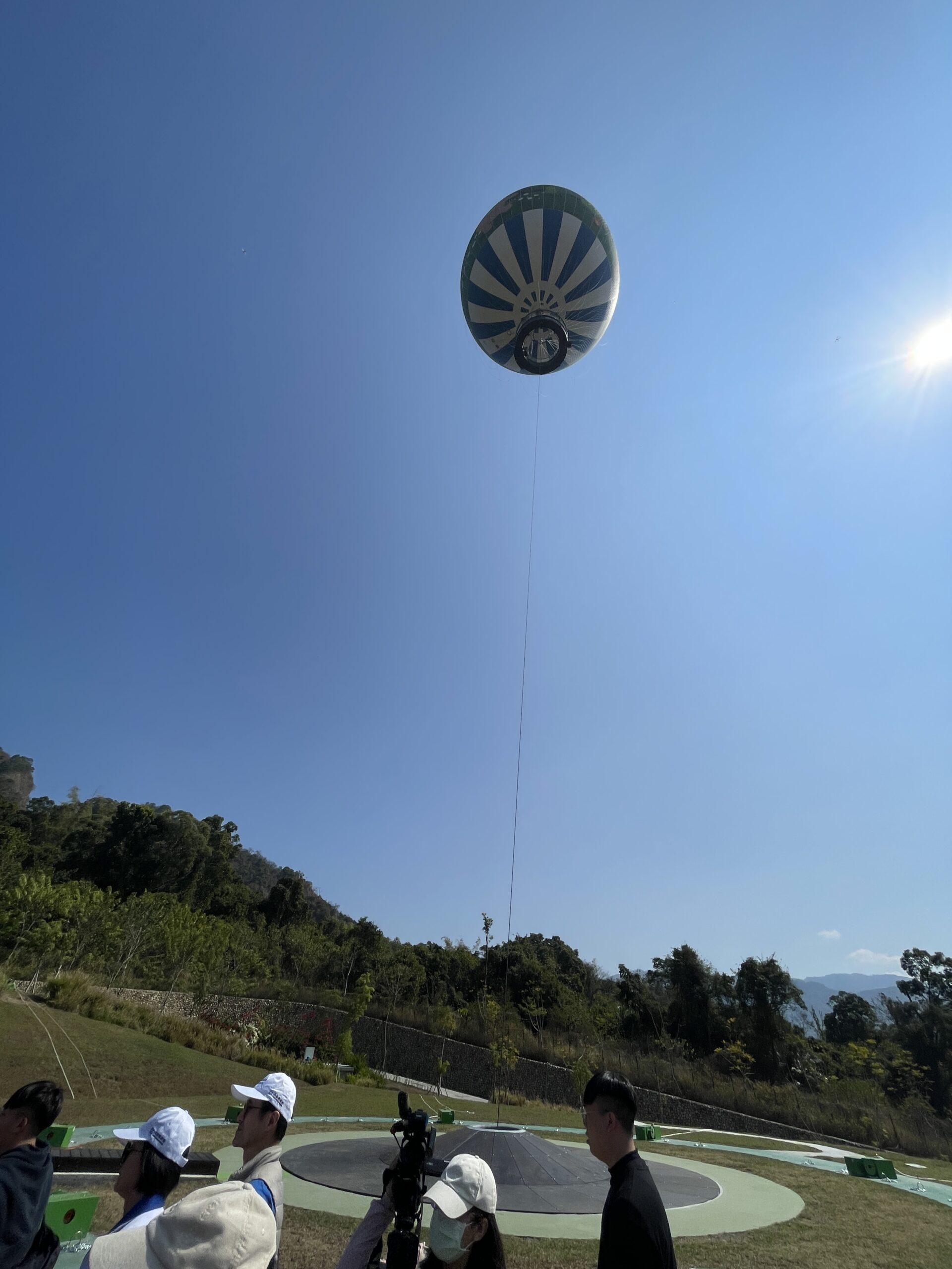 九九峰氦氣球試營運首日起飛與降落遇熱對流有點晃,許縣長說,基本上相當平穩,不會讓人有暈眩感等不舒服,搭乘的貴賓感受相當好。