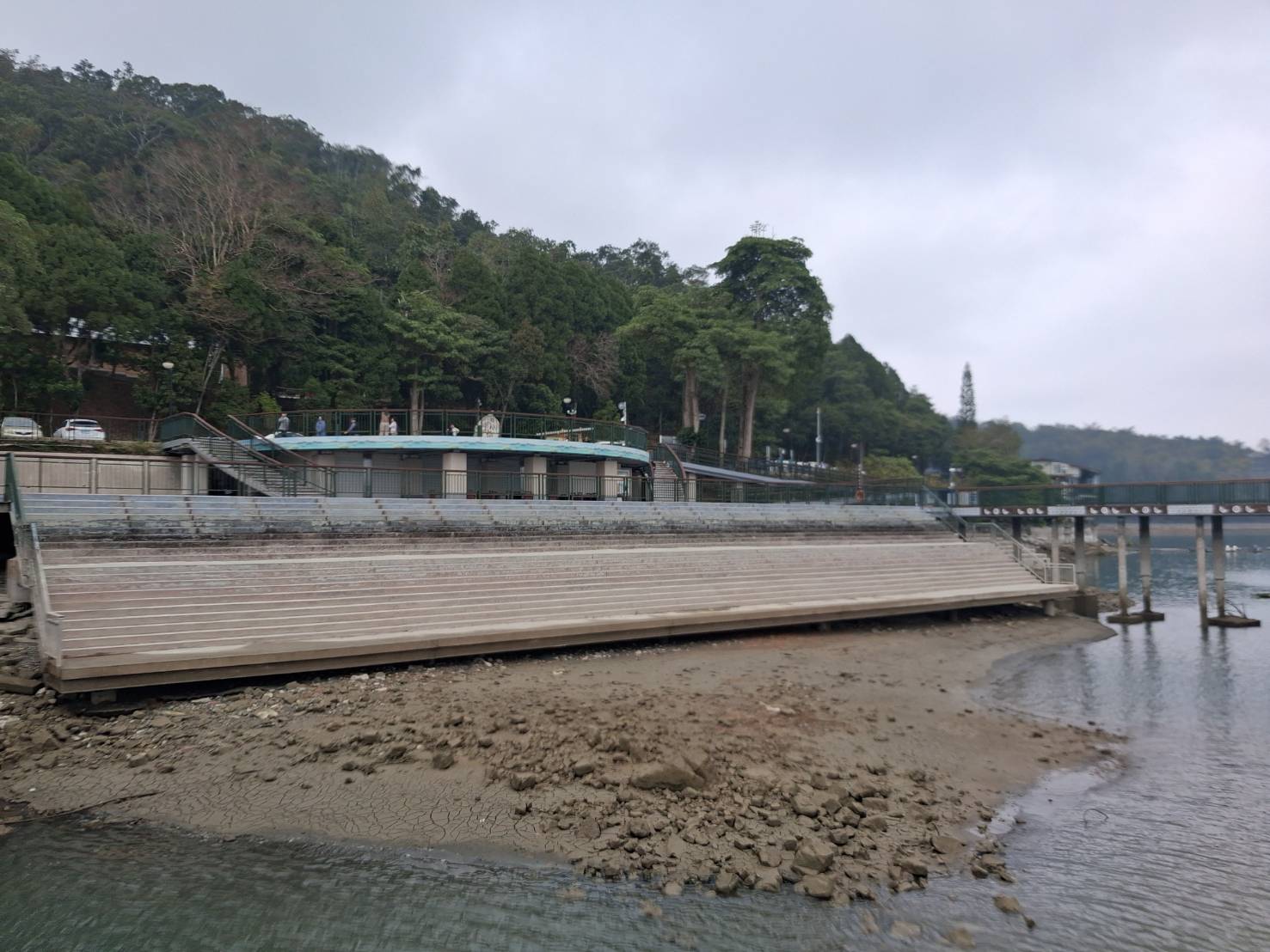 入冬至今乾旱少雨,日月潭水庫水位預計2/20日將降至743公尺以下,朝霧碼頭在水中的階梯全都露,日管處啟動第二階段應變。圖/日管處提供