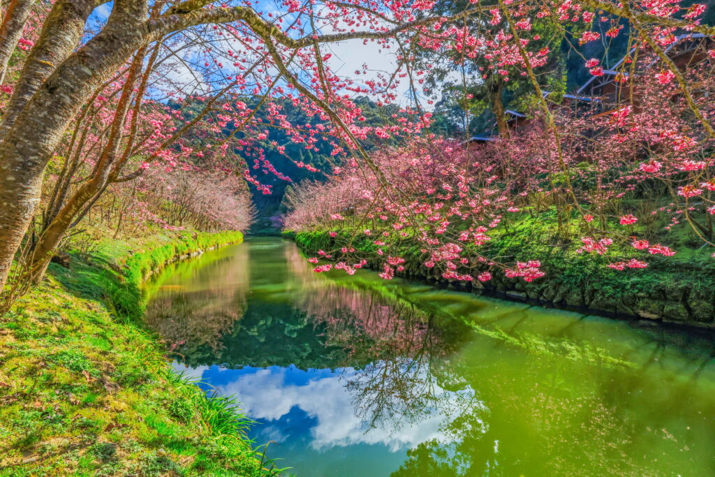 杉林溪春櫻首部曲在木屋區前櫻花河岸:正上演全台唯一獨家的粉紅櫻花倒影奇景,228盛開將捲起一場粉紅風暴。圖/杉林溪提供