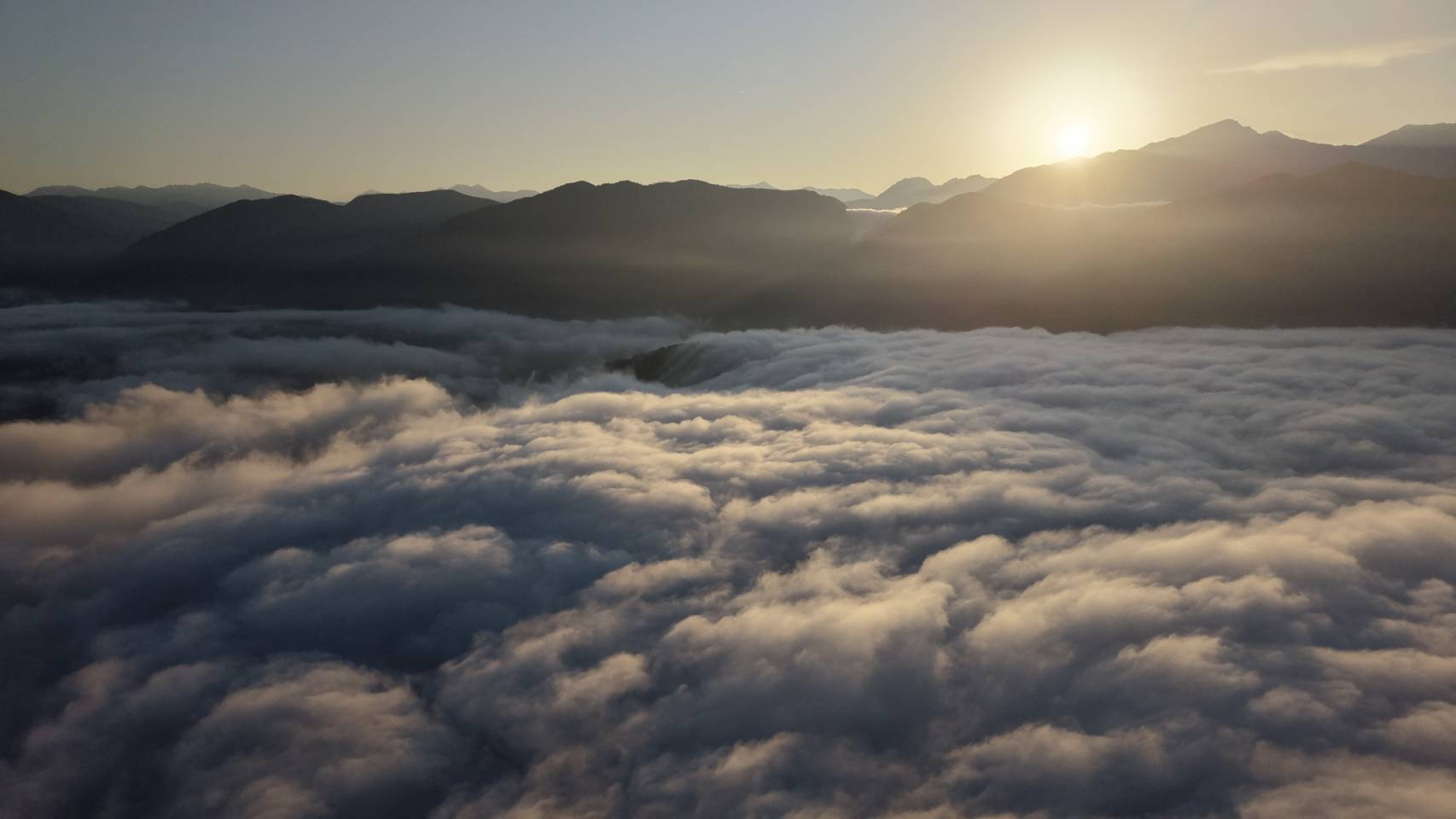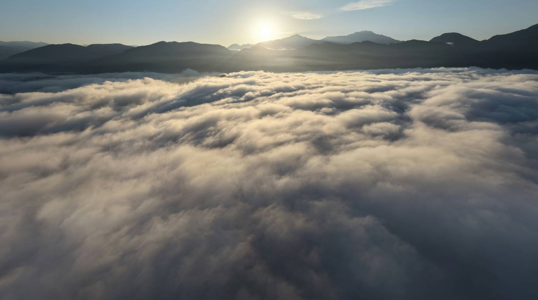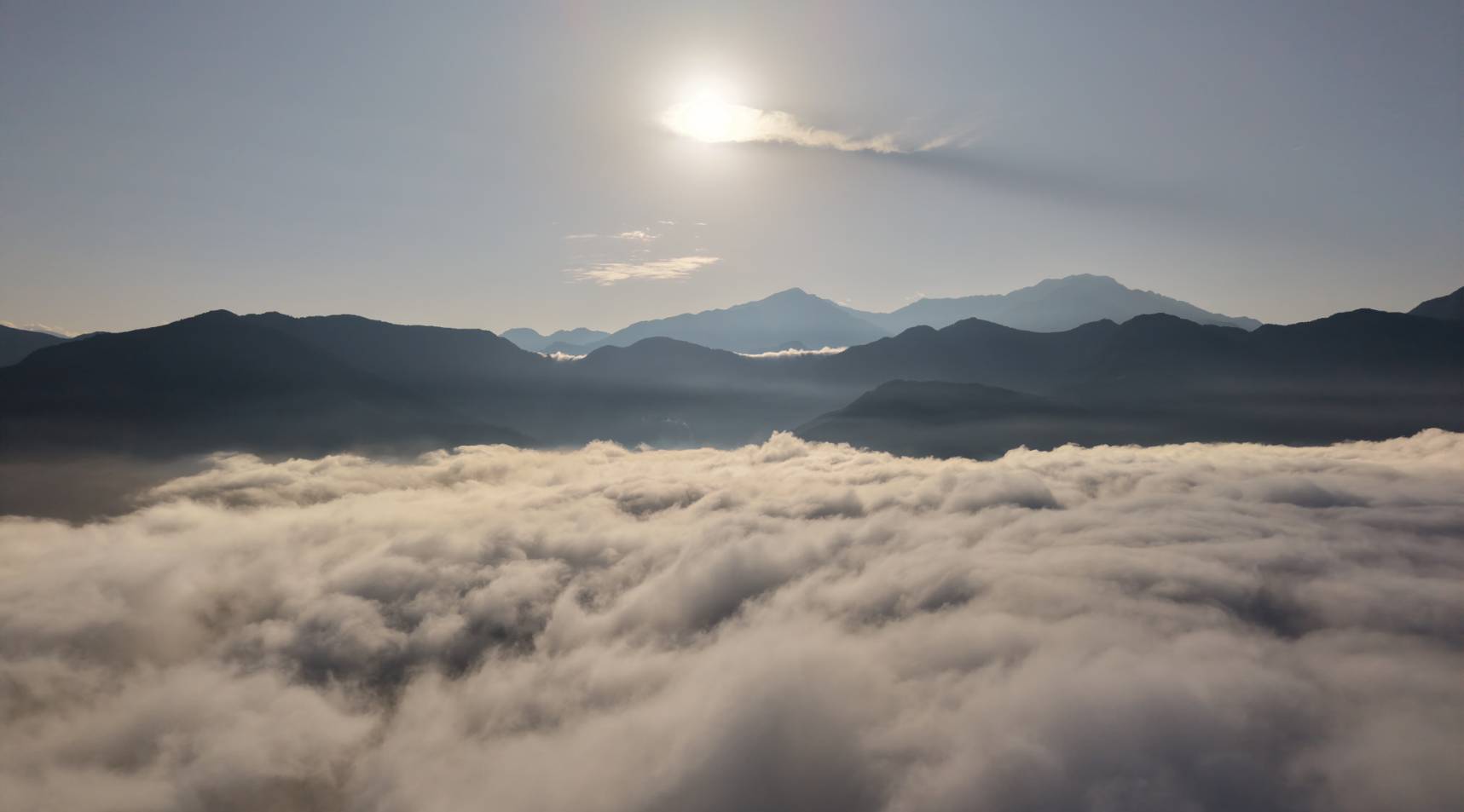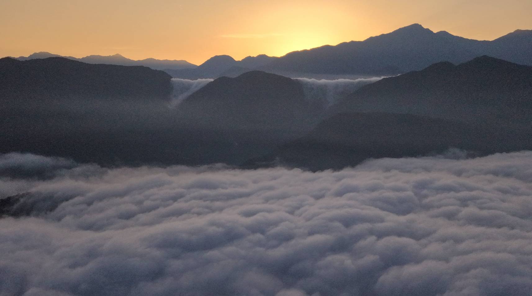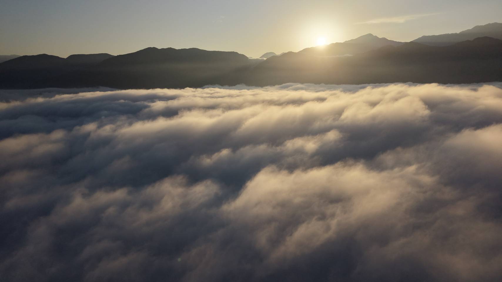 持續幾天的春雨 埔里盆地水氣豐沛 六日清晨小鎮南方鹹菜甕雲霧繚繞 雲海在山谷間翻騰 地方文史工作者潘樵一次捕捉日出 雲海雲瀑在山嶺間躍動