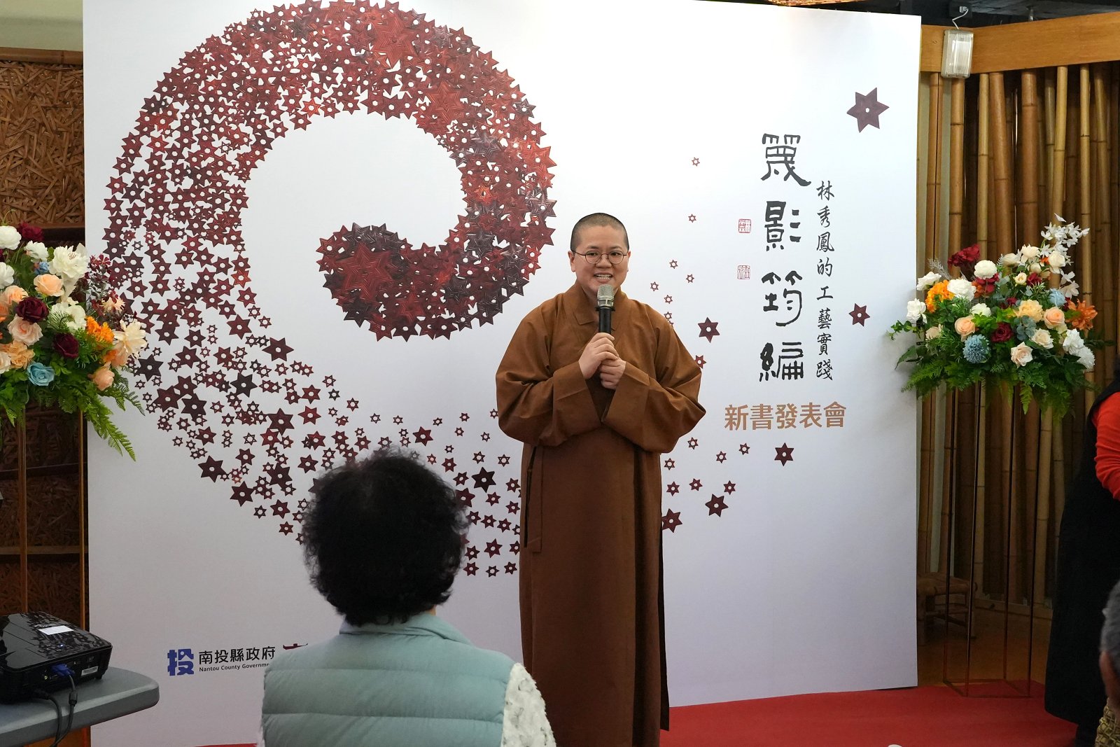 佛光山惠中寺美術館主任知常法師分享林秀鳳藝師新書出版的成果與喜悅。圖/南投縣文化局提供