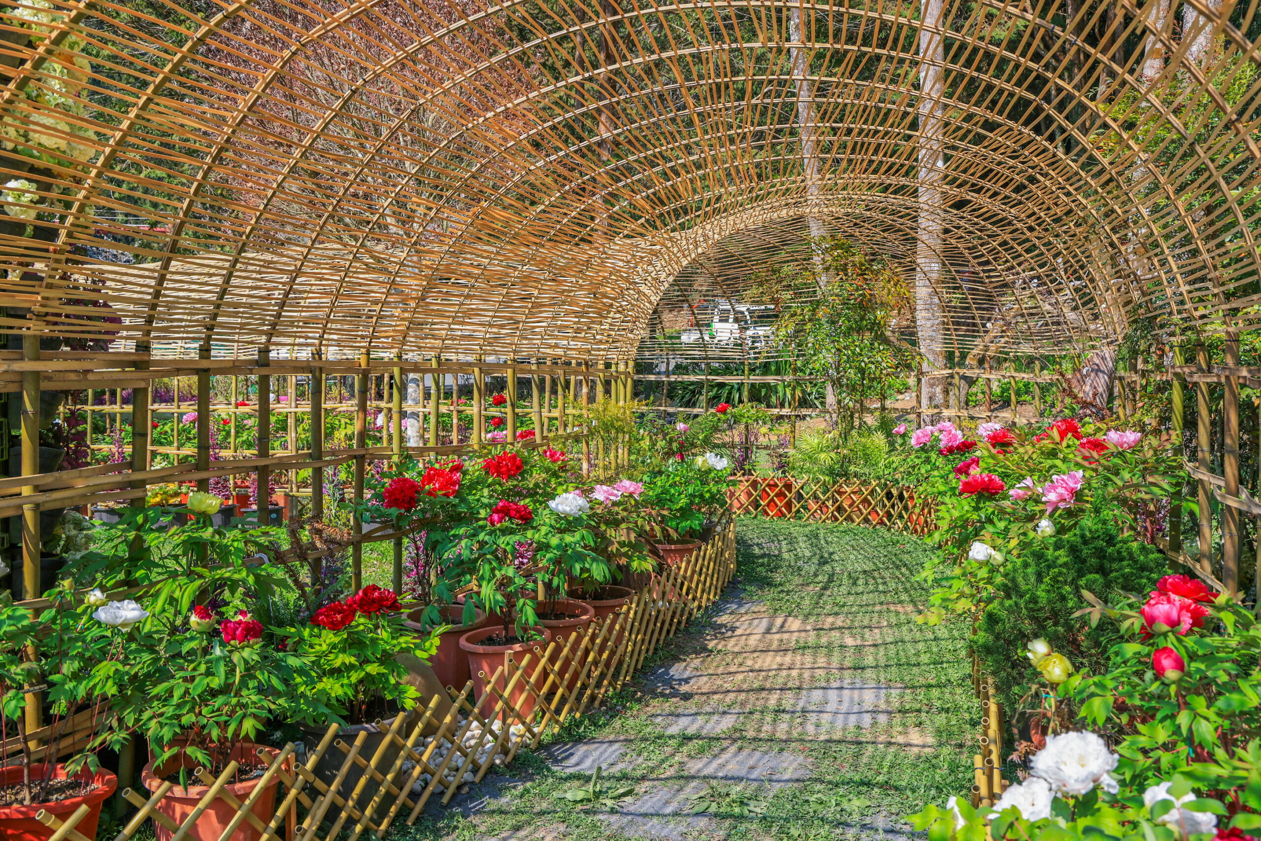 杉林溪牡丹花首度戶外展出 全面提升賞花質感 你可在戶外空間竹編遮陽廊道與遮蔽傘 放慢腳步欣賞嬌貴的牡丹花綻放之美